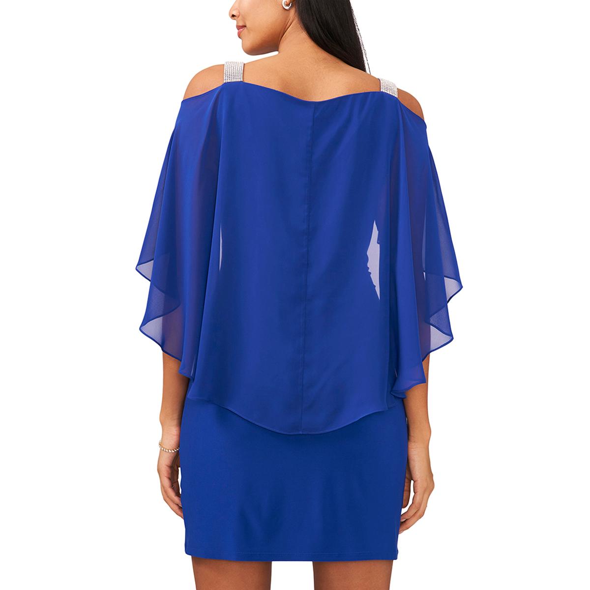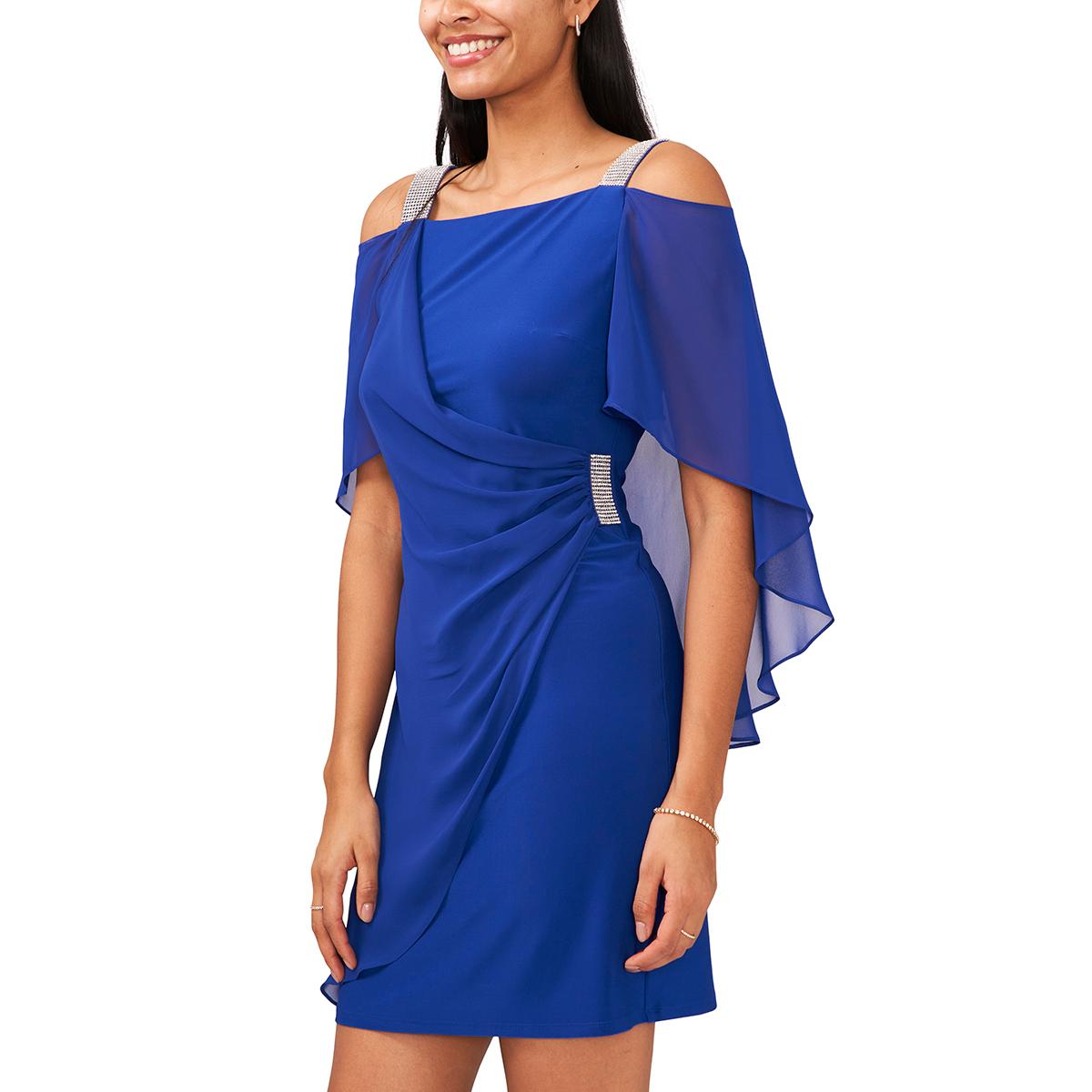 Turn up your style by wearing this Womens MSK rhinestone embellished capelet overlay side drape dress.