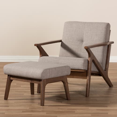 This Baxton Studio Bianca arm chair and ottoman set will welcome plush comfort into your home with the vintage style. They are constructed of durable rubber wood for exceptional durability and stable comfort and upholstered in polyester to give them a vintage feel. This set features a smooth angular solid wood frame in dark walnut finishing for a nod to mid-century modern design that exudes warmth. The retro modern chair set is built with clean paneled lines on the seat back, bringing relaxing vibes into your living room and complementing your home with lavish style. Spot clean only. Made from 100% Polyester and Rubber Wood.