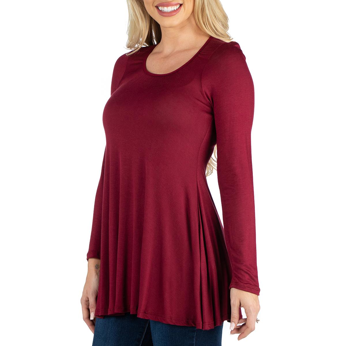 This Womens 24/7 Comfort Apparel tunic length long sleeve combines comfort and style for a chic feminine look. The flared cut accentuates natural curves while the swing style hem, which reaches down to the hips, radiates flowing feminine elegance and allows for ease of movement. The round neck and soft, stretchable fabric make for easy pullover styling. Dress up any pair of jeans with this classy addition to the fall wardrobe.