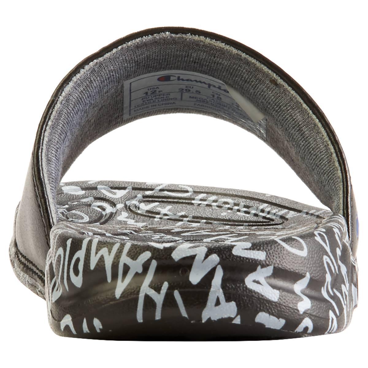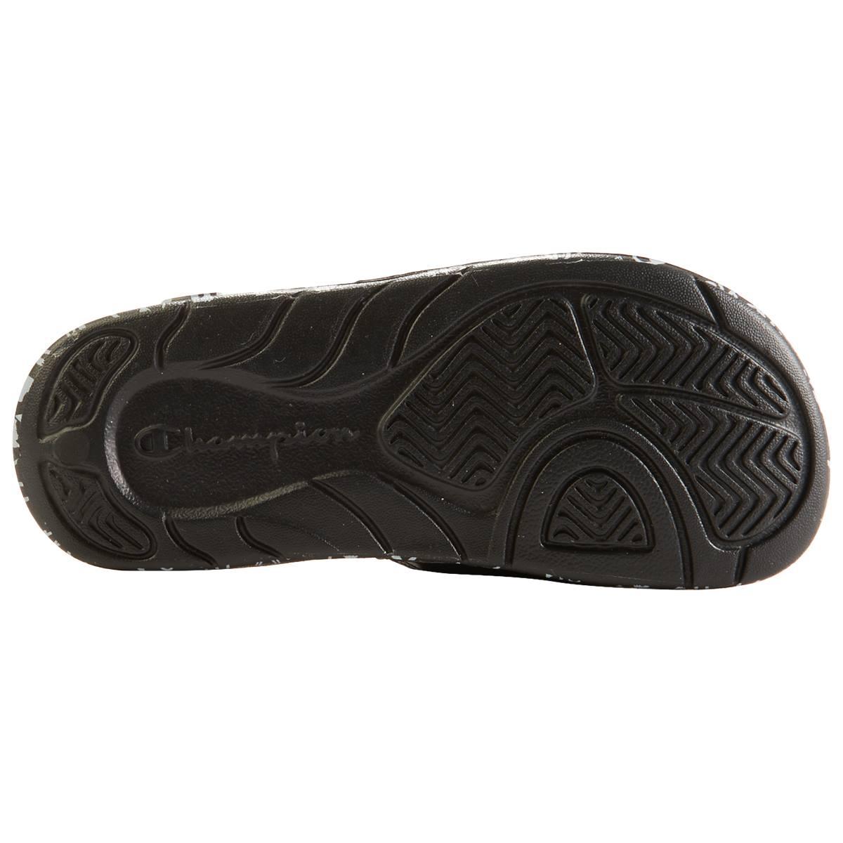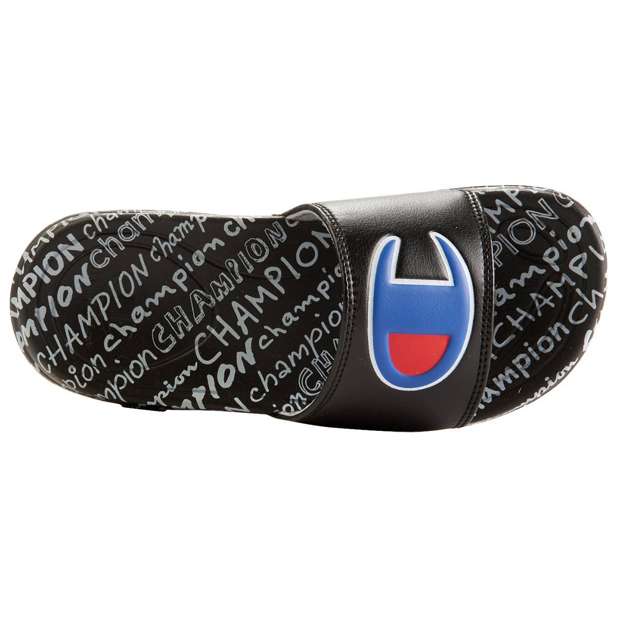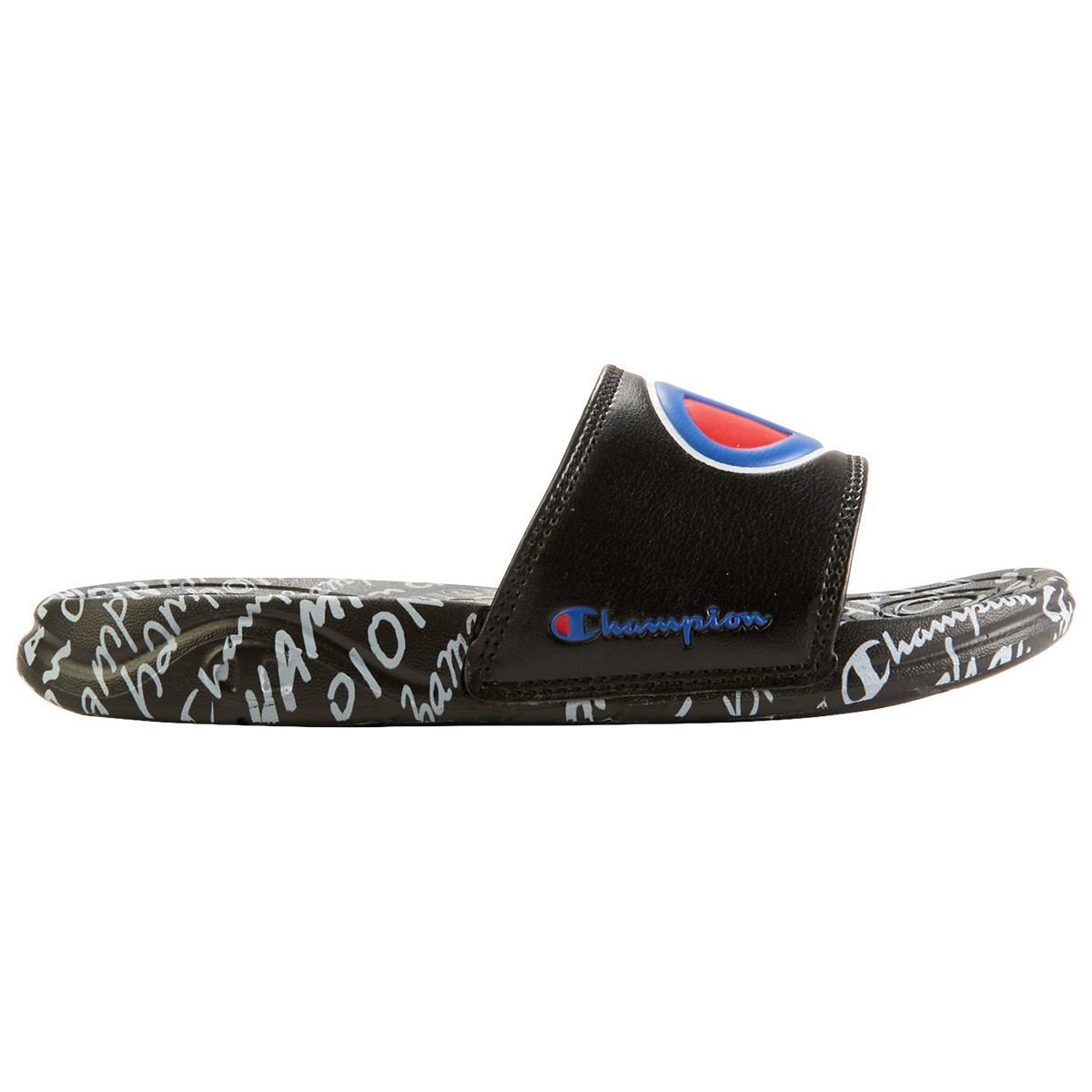 Description Slide right into these Big Kids Champion® Mega Script Repeat B athletic slide sandals. Featuring a padded footbed and a signature logo on the front. Step out of the...