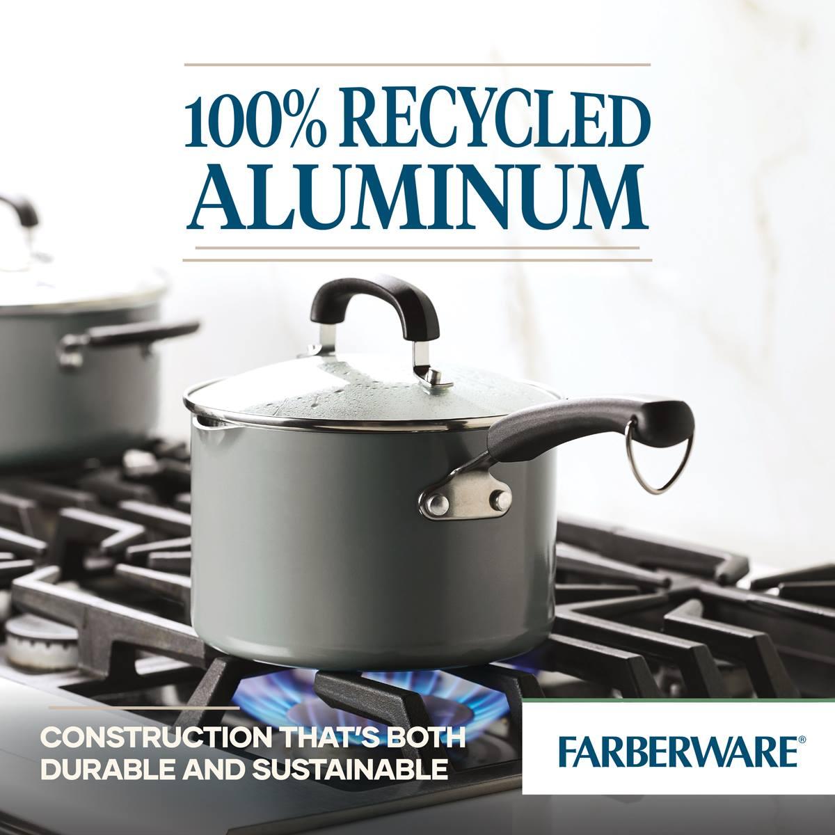 Made from 100 percent recycled aluminum, Farberware® Eco Advantage™ Non-Stick Cookware is designed with care and quality for healthy family cooking and a healthier planet for generations to come. This Farberware® Eco Advantage™ 3qt. saucepan with lid features a non-toxic, longer-lasting, scratch-resistant ceramic nonstick for reliable performance in busy family kitchens, and a practical design includes conveniences like pour spouts, a unique straining lid, and dishwasher-safe cleanup. The comfortable, stay-cool handle is double-riveted for a secure and confident grip, and the saucepan is oven safe to 350°F for out-of-the-box, recipe-ready performance. Bring cookware to the family kitchen that´s eco-friendly, safe, and easy to cook on, and doesn´t sacrifice an ounce of quality along the way. When it´s time to cook with love (and help the planet) cook with Farberware® Eco Advantage™.