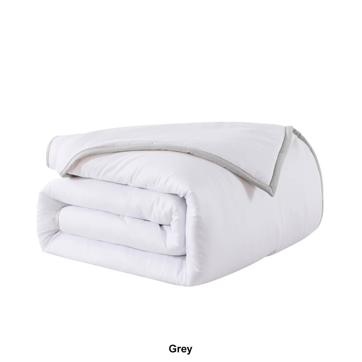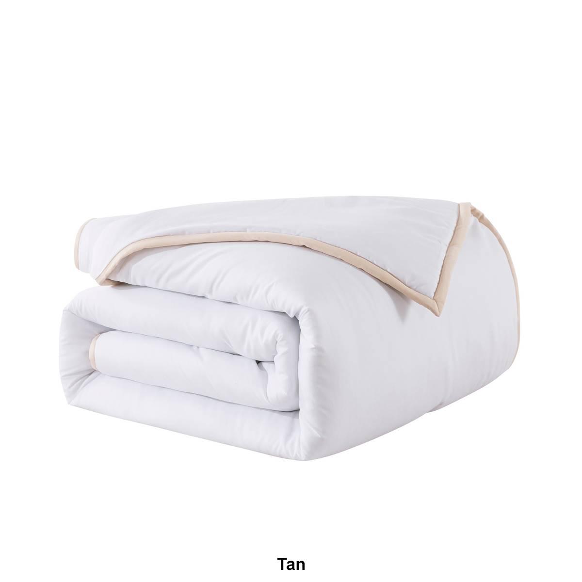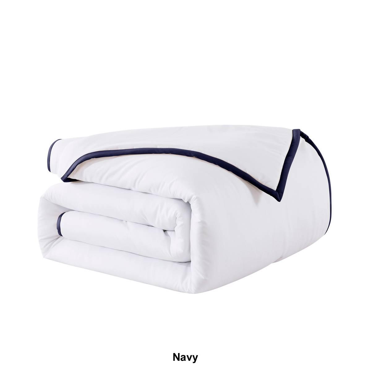 The hotel-inspired Framed Down Comforter is the perfect combination of classic with a hint of flair. The comforter and shams are bordered with a 1-inch trim in timeless colors to match any style. Jump and tack stitching is designed throughout the comforter to help secure the fill in place for a long-lasting piece. The soft microfiber cover is the perfect choice for anyone looking for a comfortable, effortless comforter set. Hypoallergenic polyester fill will provide you with year-round warmth and comfort. The Comforter is machine washable for easy and convenient care.