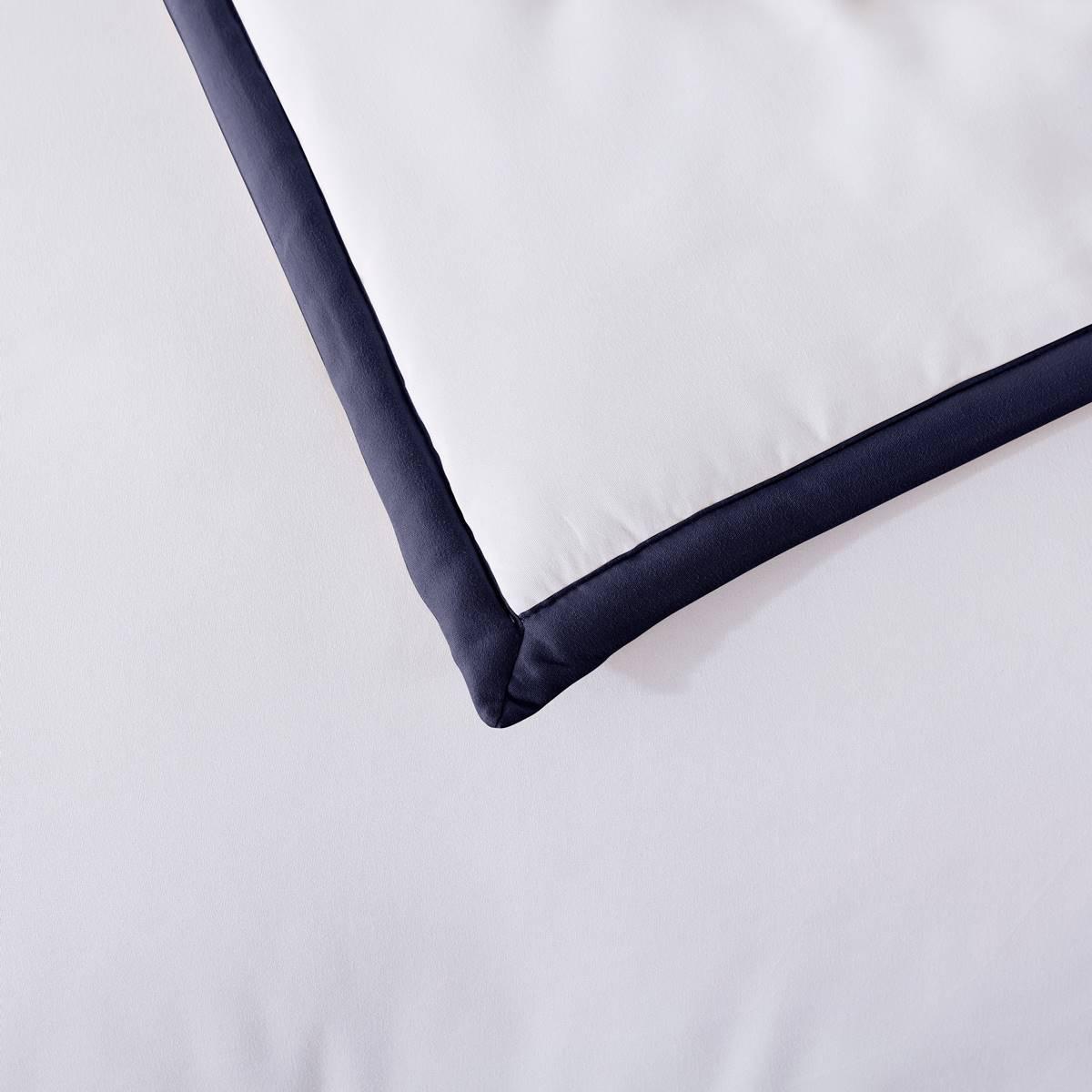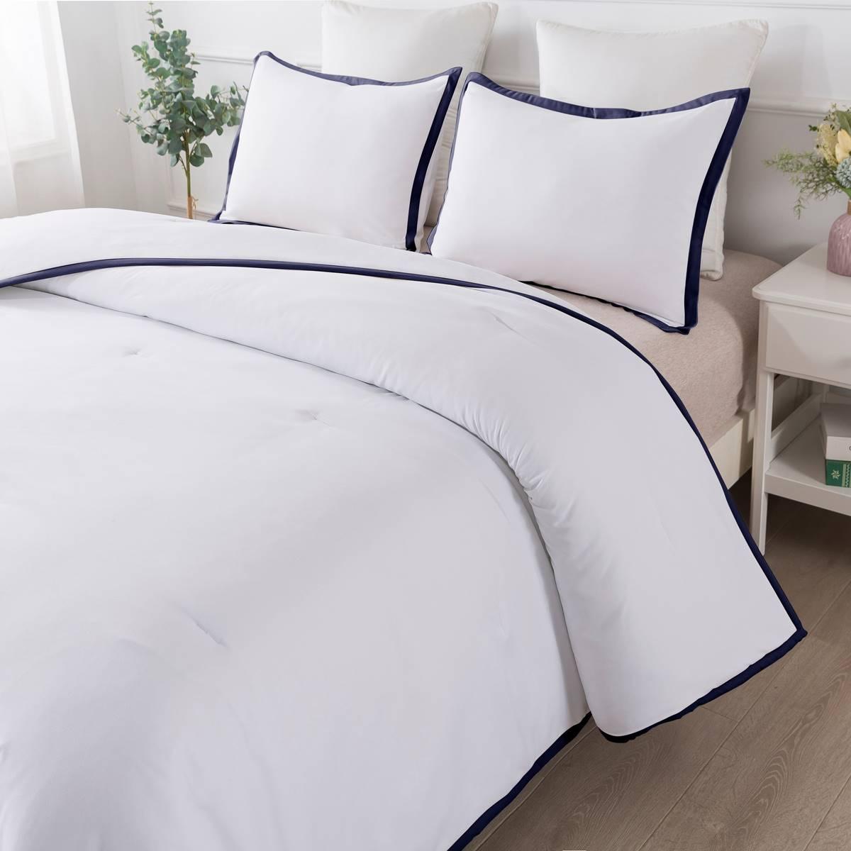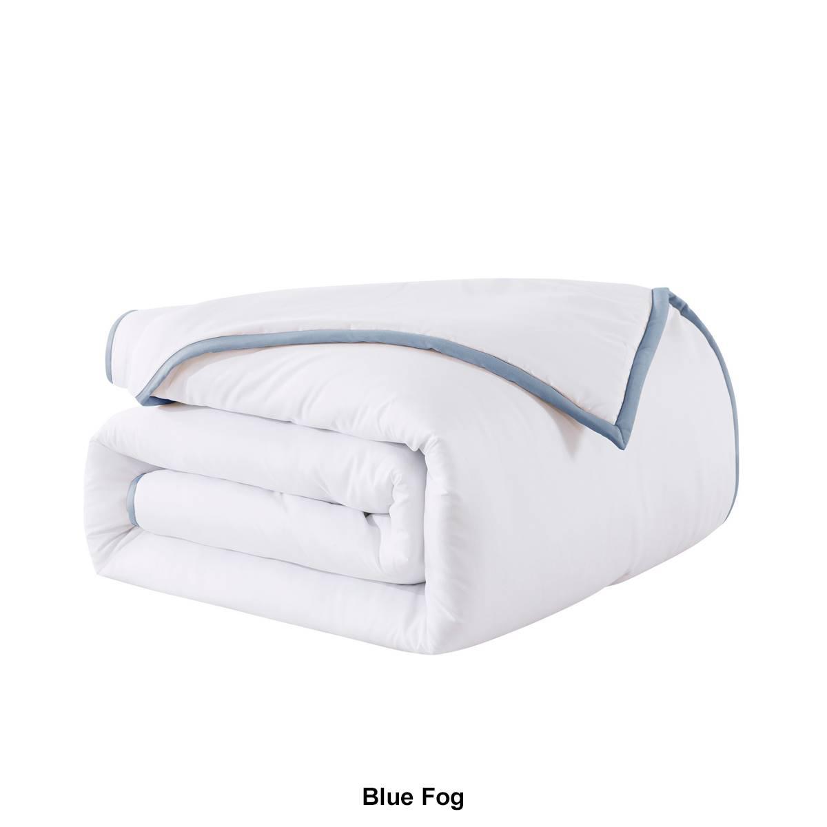 The hotel-inspired Framed Down Comforter is the perfect combination of classic with a hint of flair. The comforter and shams are bordered with a 1-inch trim in timeless colors to match any style. Jump and tack stitching is designed throughout the comforter to help secure the fill in place for a long-lasting piece. The soft microfiber cover is the perfect choice for anyone looking for a comfortable, effortless comforter set. Hypoallergenic polyester fill will provide you with year-round warmth and comfort. The Comforter is machine washable for easy and convenient care.