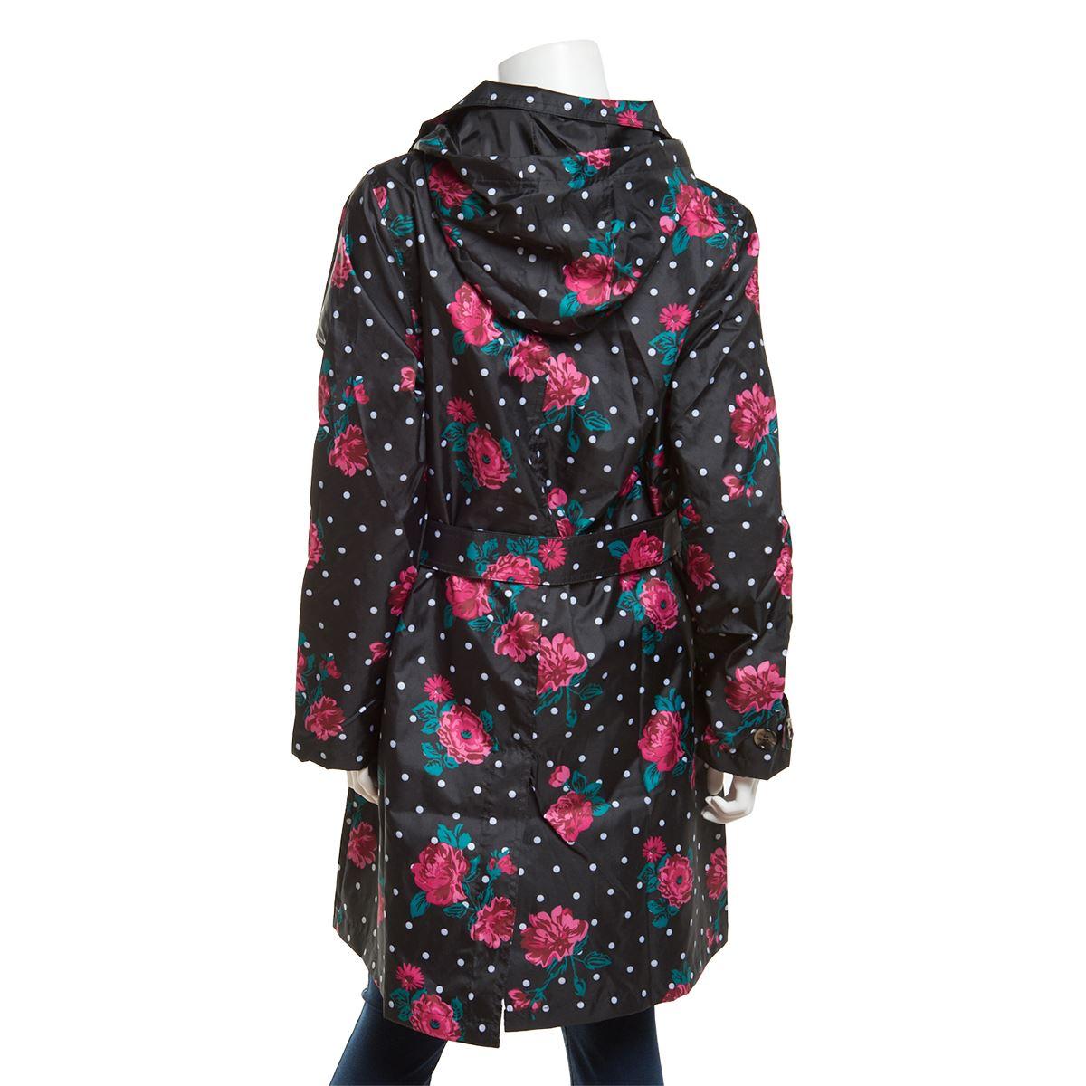 Complete that springtime chic look with this fun Womens Capelli New York mid-length floral dot combination print rain slicker. The belted water resistant style features a button front closure with long sleeves and a drawstring hood. Also includes 2 functional pockets.