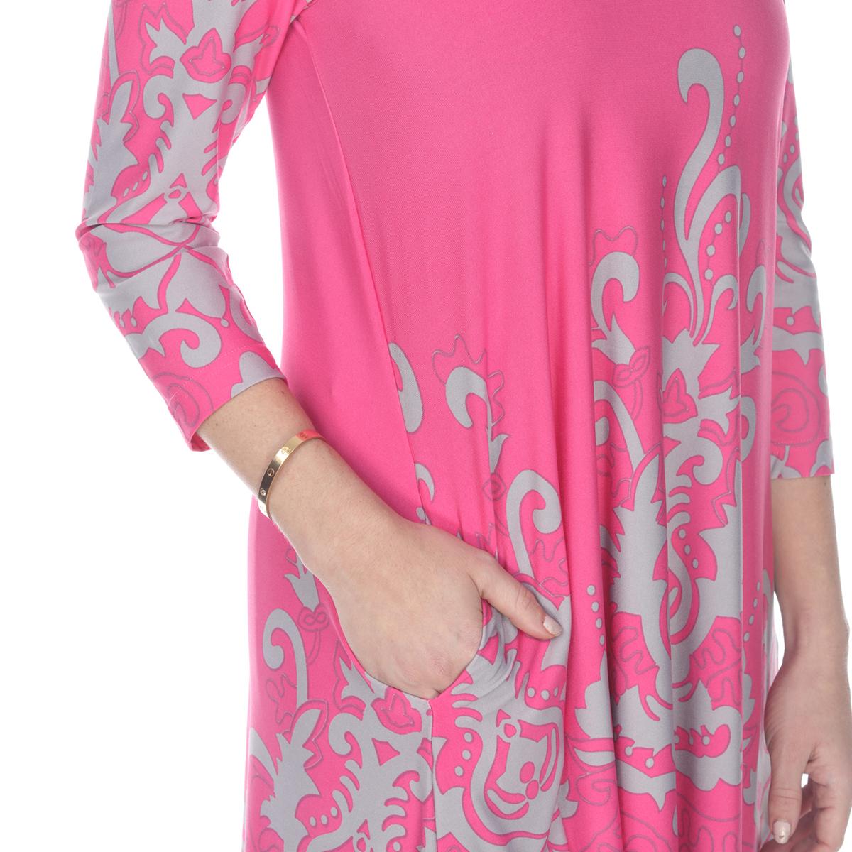 This White Mark Yanette pink and grey printed tunic top will make a chic addition to your clothing collection. Its flattering design drapes effortlessly across your body with a bold and flirty print. Other features include a boat neck and 3/4 length sleeves that will make you look stylish and feel comfortable.