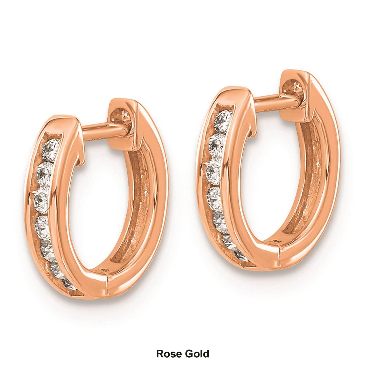 Description Uplift your everyday look effortlessly with these charming Pure Fire 14kt. rose gold lab-grown diamond hoop earrings. Ornamented with 0.14ctw lab-grown round diamonds...