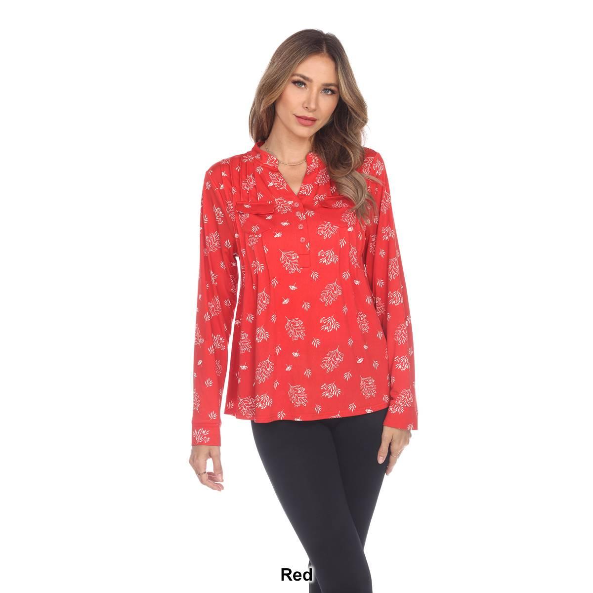 Description Indulge in this Womens White Mark pleated long sleeve leaf print blouse for a classic modern look. This top features an open mandarin collar with a v-neck and button...