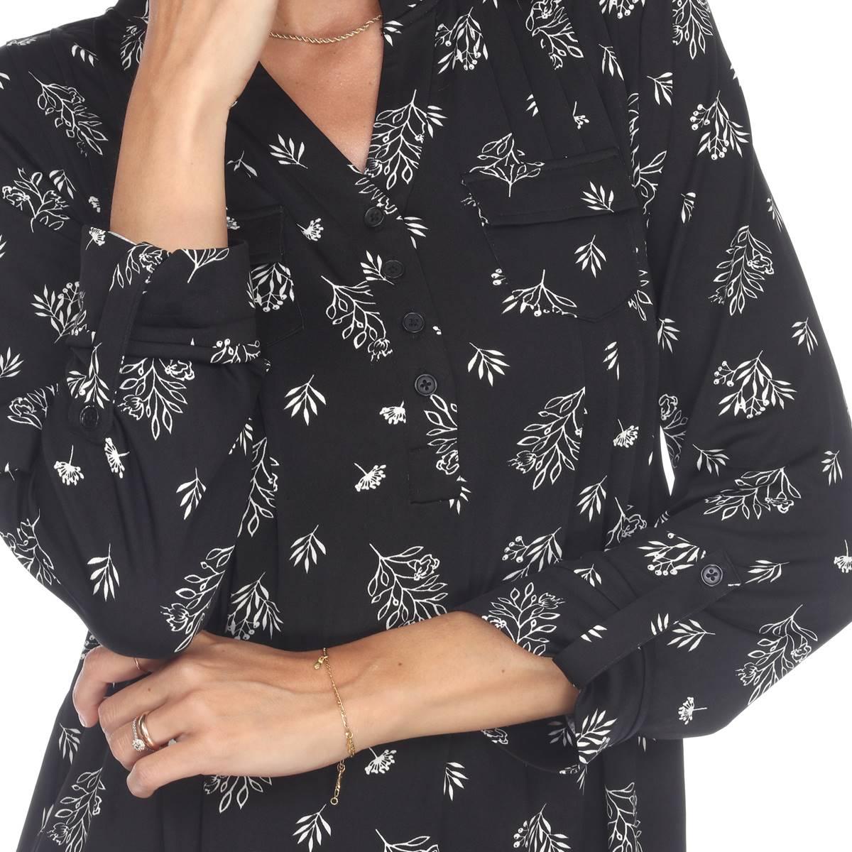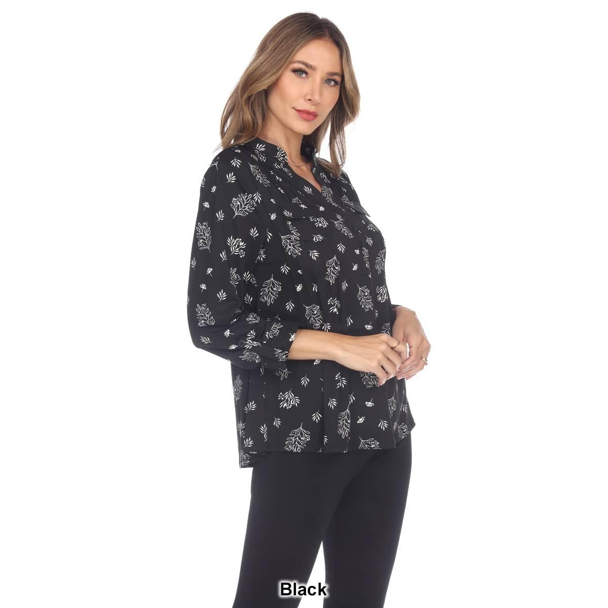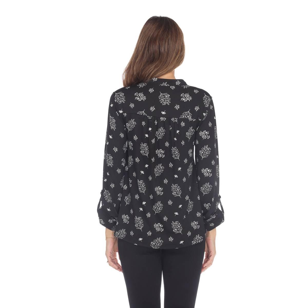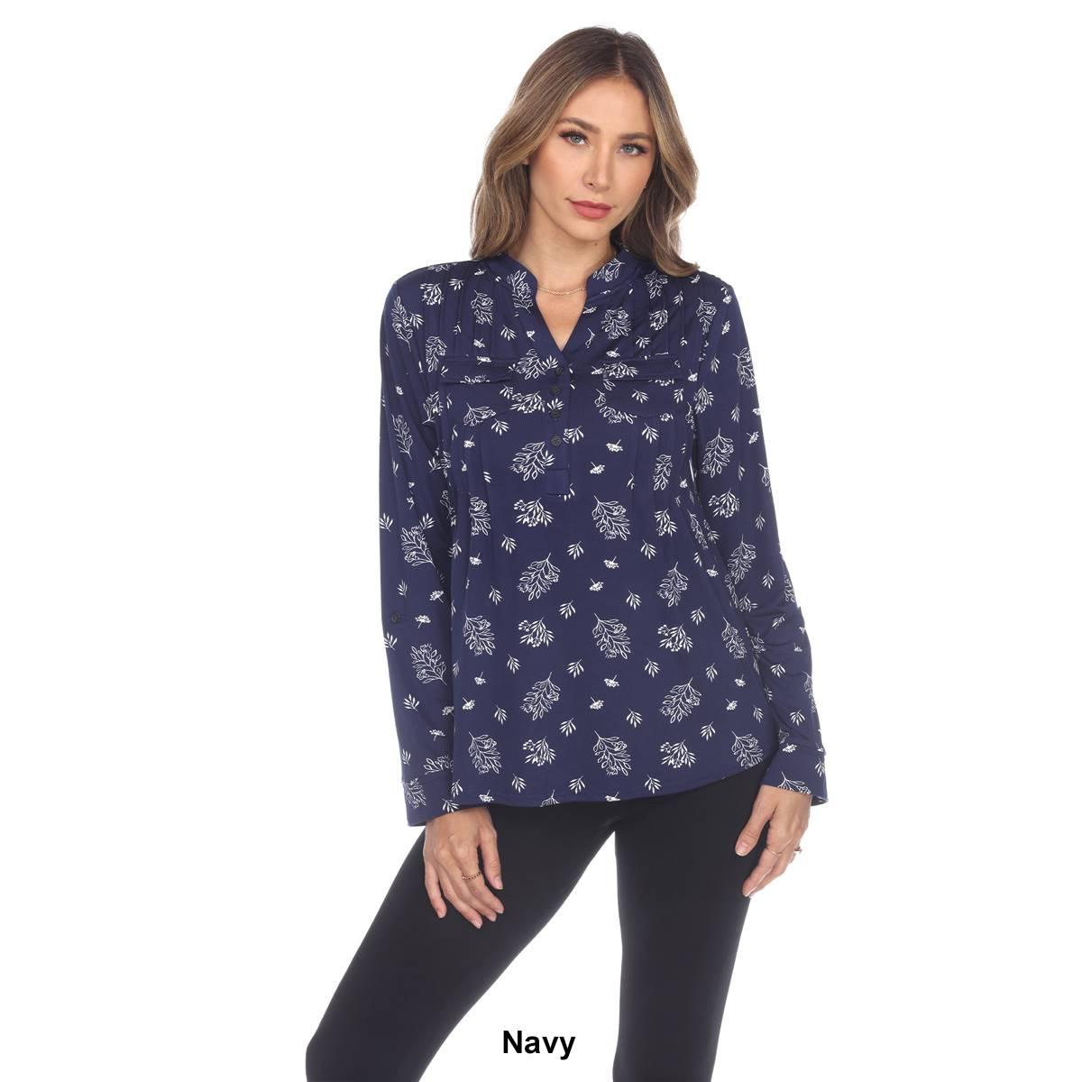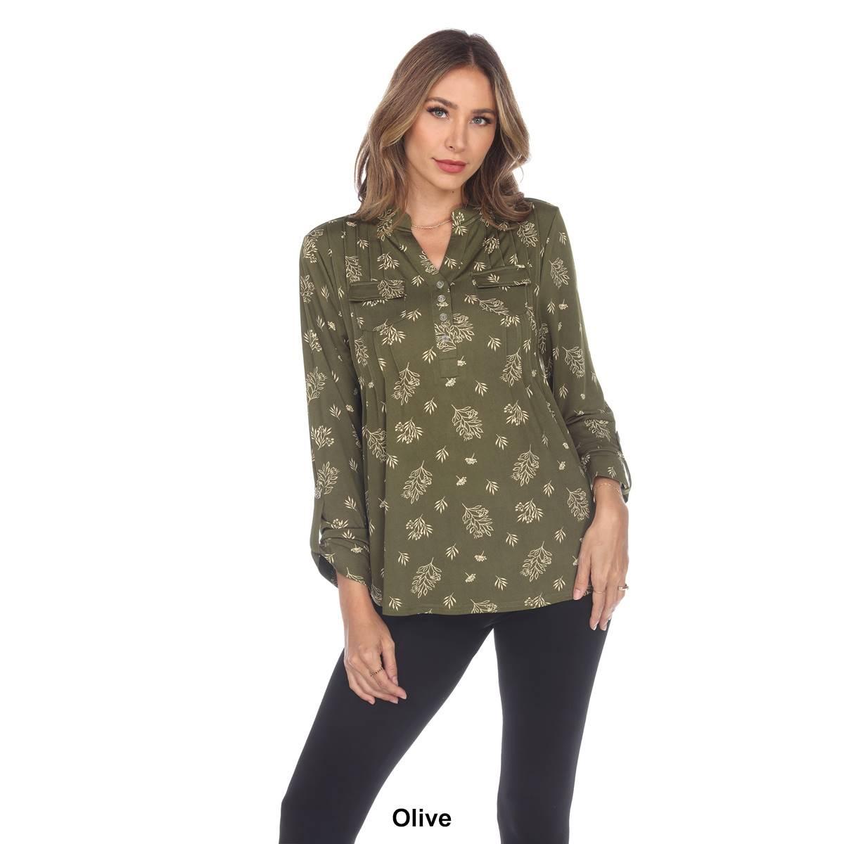Indulge in this Womens White Mark pleated long sleeve leaf print blouse for a classic modern look. This top features an open mandarin collar with a v-neck and button closure at the chest, functional pockets at the bust, pintuck pleats at the front, yoke pleating back, and a rolled cuff with button tag closure. Has great stretch for unparalleled comfort.