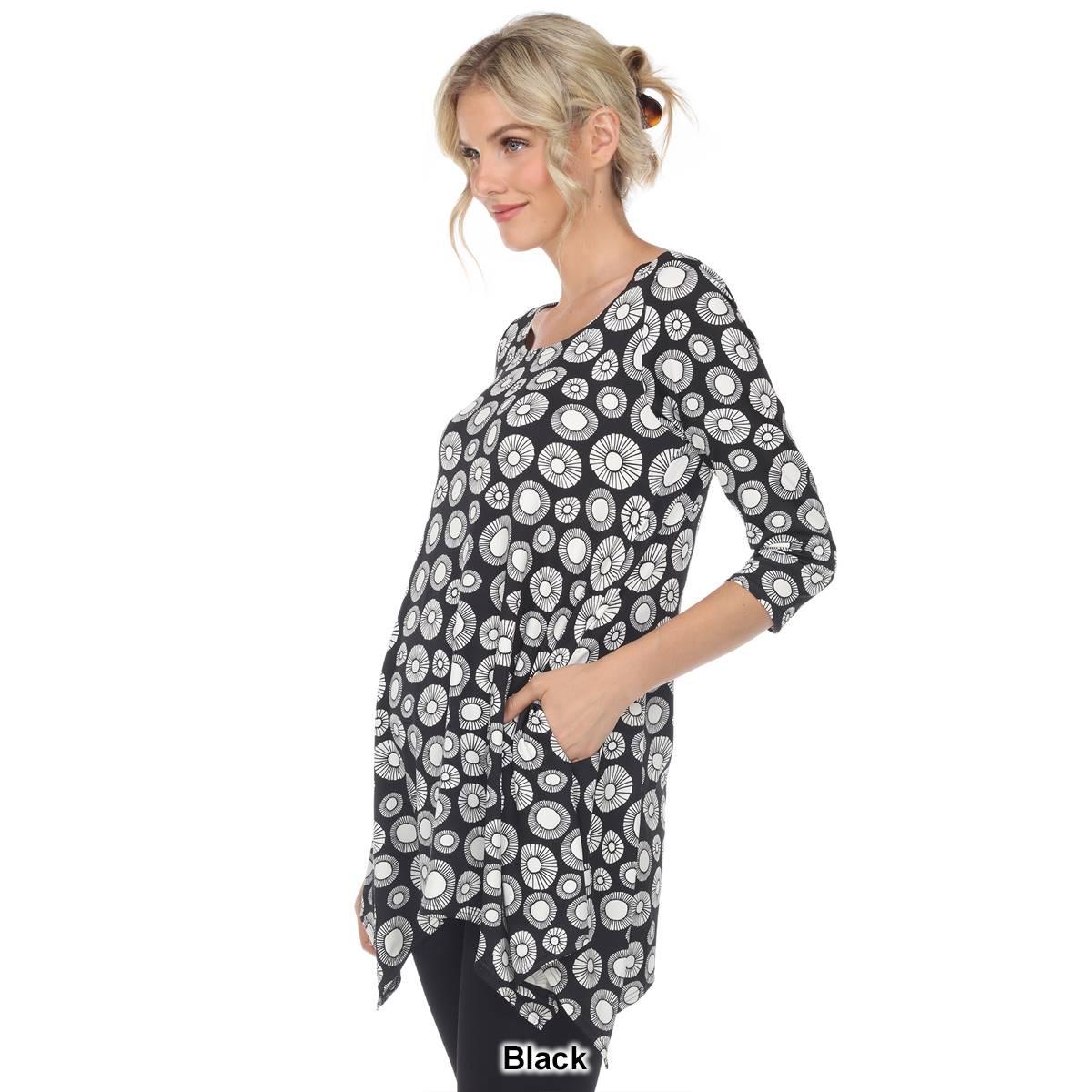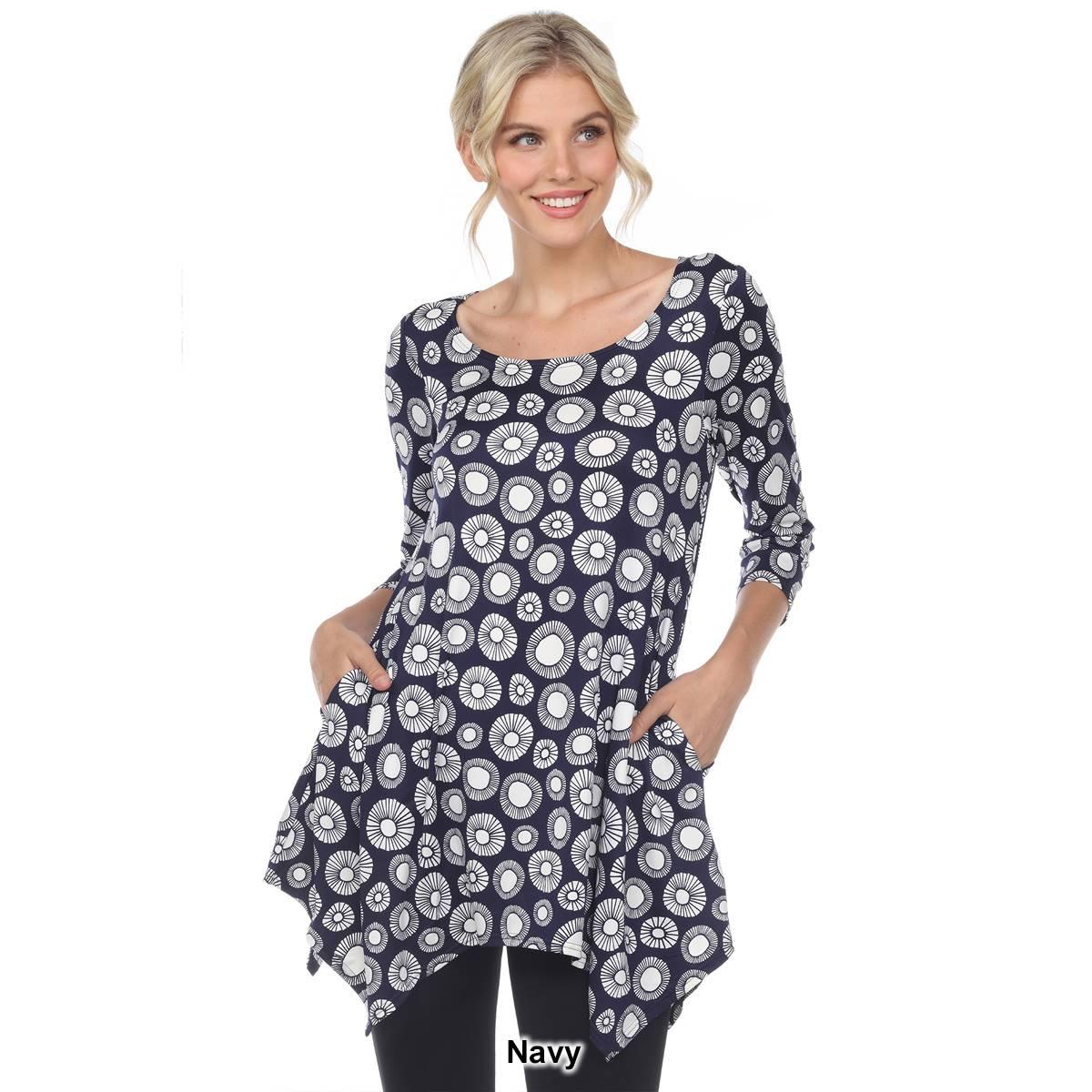 Description Stand out with this Womens White Mark geometric circle tunic top. Features 3/4 sleeves, scoop neck, and shark bite hem. This tunic is so versatile you can pair it...
