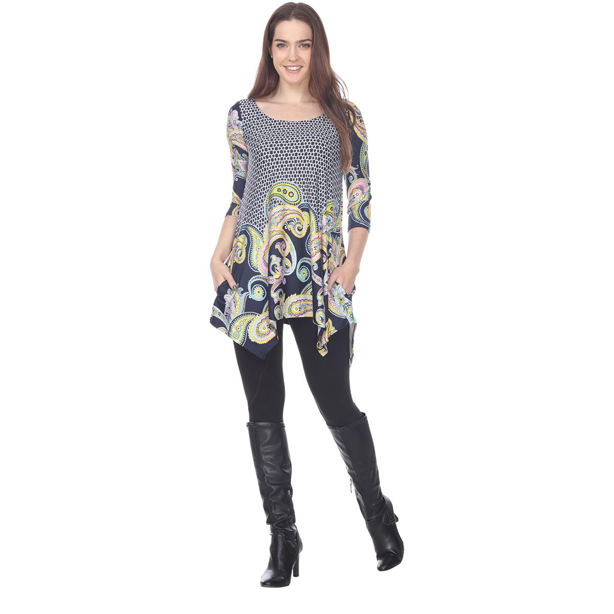 This Womens White Mark Teagan bold printed tunic will make a chic addition to your clothing collection. Its flattering design drapes effortlessly across your body with a bold and flirty print. Other features include a boat neck and 3/4 length sleeves that will make you look stylish and feel comfortable.