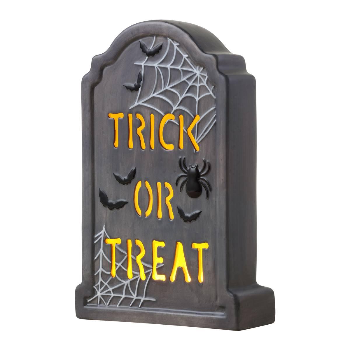 Description Create your own creepy Halloween graveyard with the Mr. Halloween Ceramic LED Tombstone. The message " Trick or Treat " is written on the front of the 10" stone to...