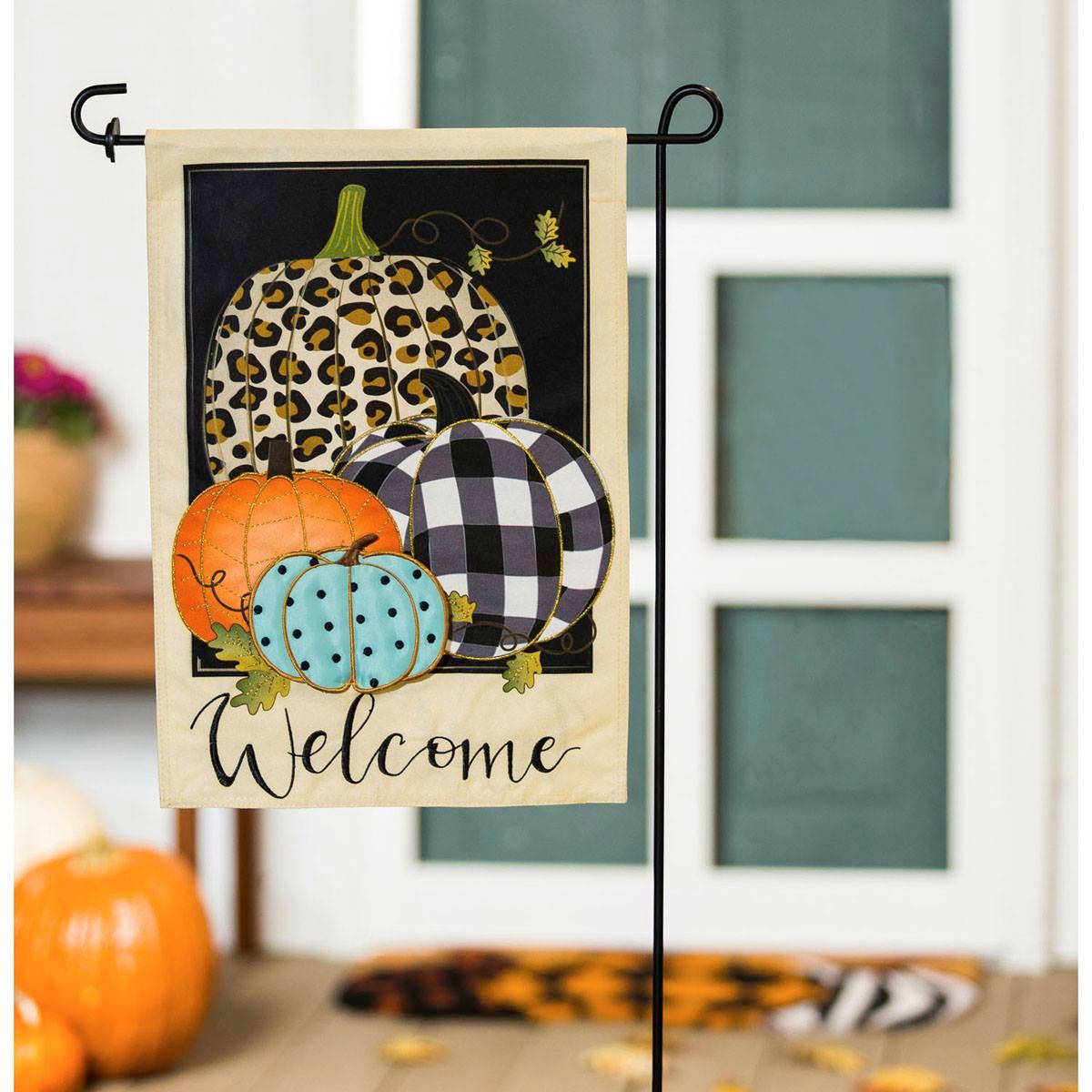 This Evergreen Mixed Print Pumpkins Garden Linen Flag makes a unique statement for the fall season. It features four patterned pumpkins against a black background with "Welcome" printed at the bottom in black letters. The largest pumpkin has a cheetah print, the next has a black and white plaid pattern, and the orange pumpkin sits next to a small blue pumpkin with black polka dots. Each pumpkin is highlighted in gold metallic thread giving the image visual 3D highlights. Made of lightweight, durable linen material, this festive flag is designed to withstand a variety of weather conditions. Our flag creation process involves combining pieces of fade-resistant fabric with tight, detailed stitching to create a dimensional effect. Printed ink colors are protected with a watertight seal, so you can enjoy your flag for years to come.