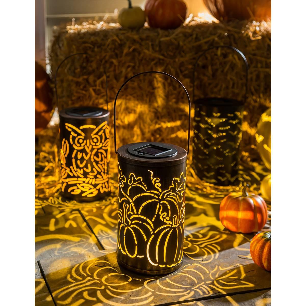 Add a festive glow to your outdoor space with this Evergreen solar oil-rubbed bronze lantern. This stunning lantern features pumpkin cutouts and an oil-rubbed bronze finish so your garden can shine with elegance throughout the fall season. Enjoy as the light casts the unique design down onto the ground below. The lantern is constructed from weather-resistant metal and plastic and has a handle for easy hanging. The top of the lantern houses the AA rechargeable battery. Allow the lantern to get 6 hours of direct sunlight to ensure a full charge and enjoy as it remains lit throughout the night.