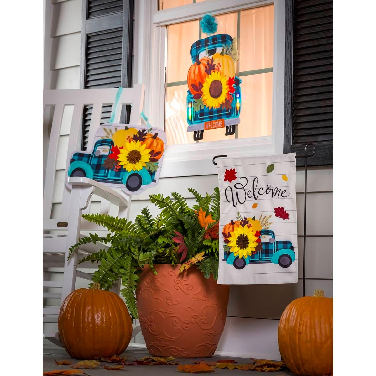 Transform your windows for the fall season with this stunning Evergreen fall plaid truck LED decor. This show-stealing accent features a truck with glowing lights that change colors to bring the design to life. Filled with pumpkins, fall leaves, and foliage, you can easily display this festive truck using the floral suction cup. This window decor has a built-in timer function that allows for 6 hours on/18 hours off. Because this window decor is made of durable textile material, it can be showcased indoors or out! Perfect for adding a glowing touch to your home that will last season after season.