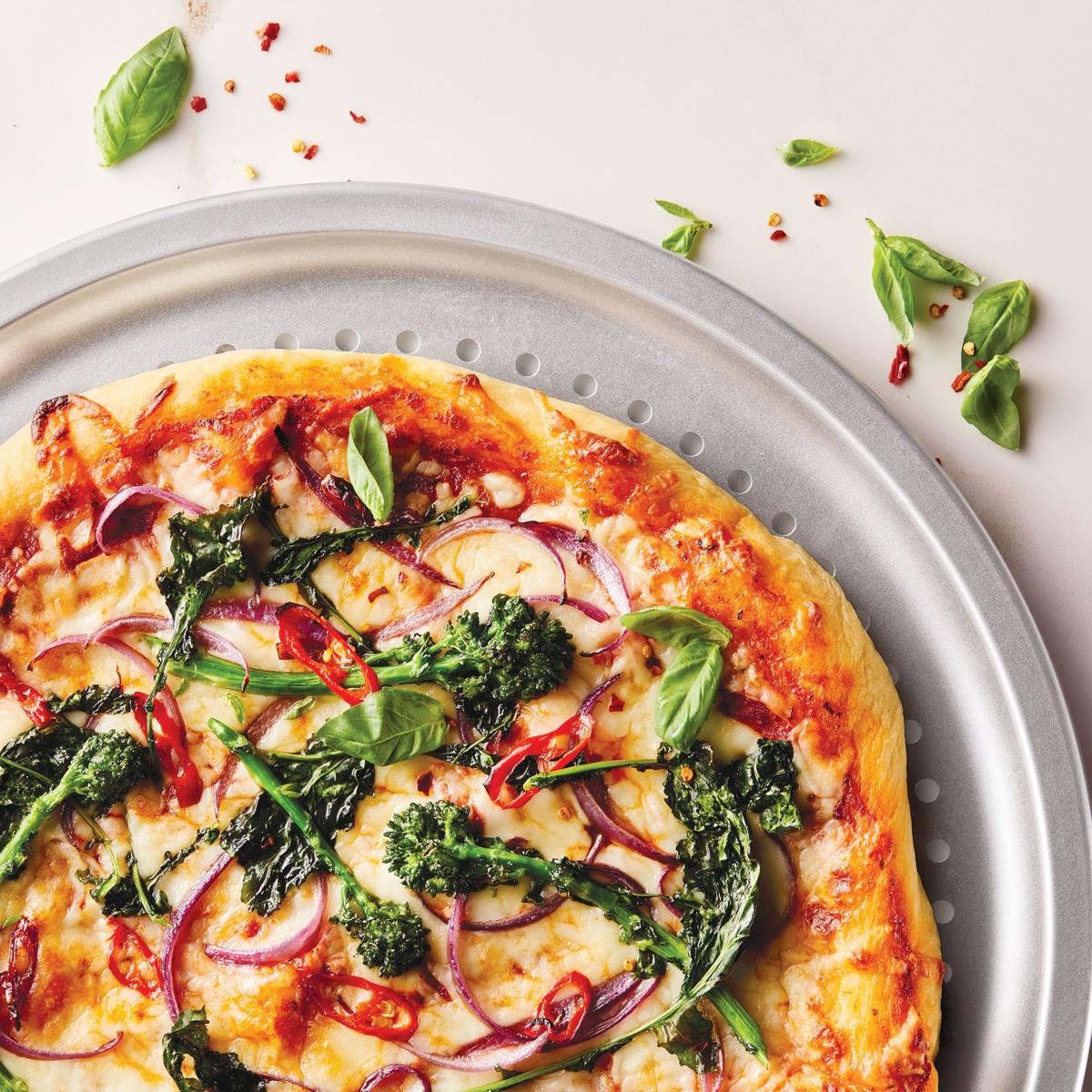 Description Make the crispiest thin crust pizzas, flatbread, calzones, and more with this Anolon® professional bakeware 14-inch perforated pizza pan. Constructed from uncoated...