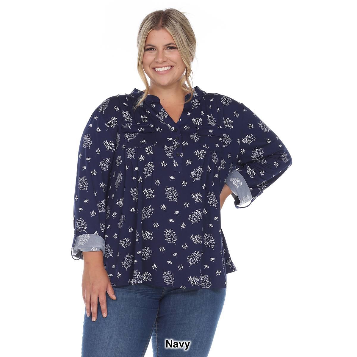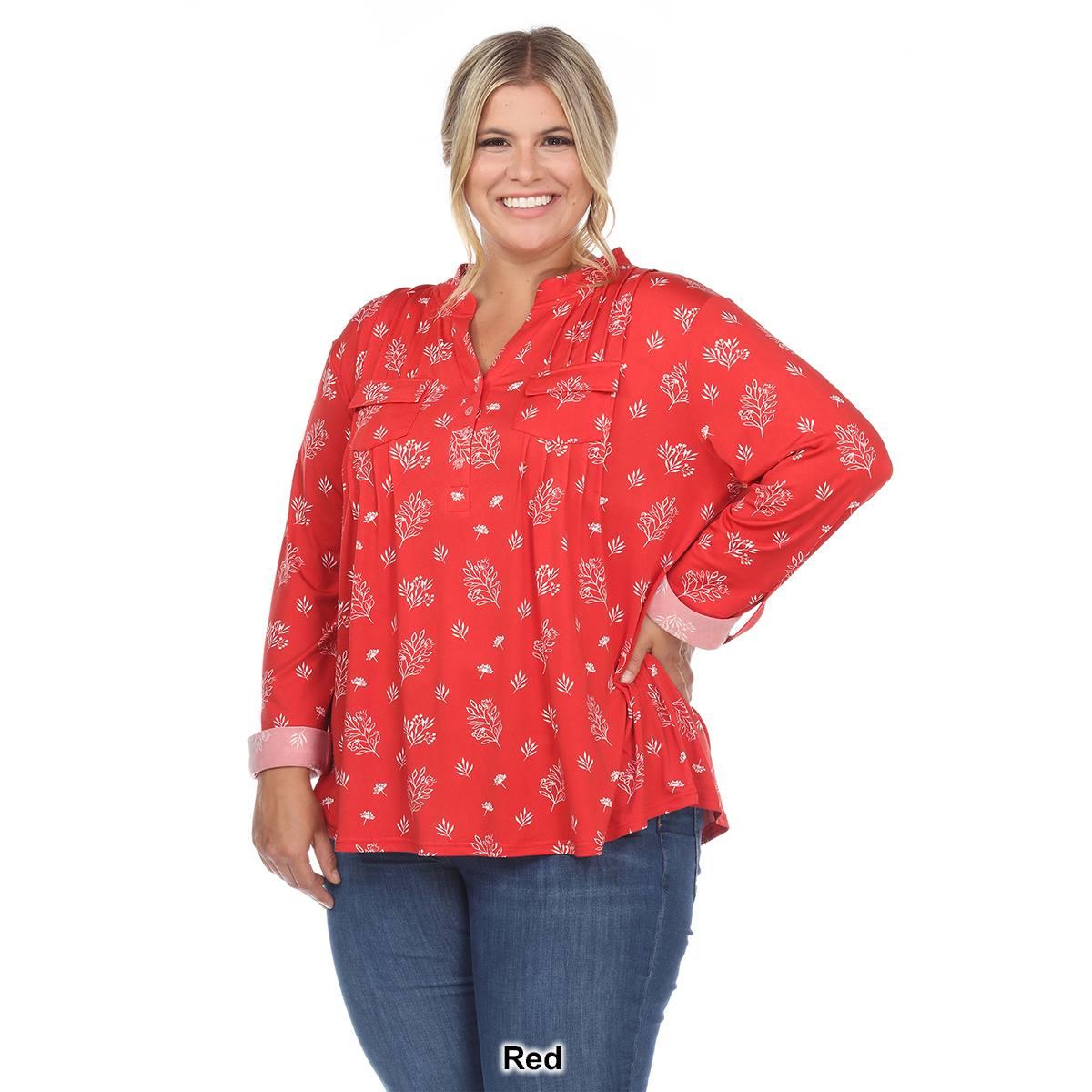 Indulge in this Plus Size White Mark pleated long sleeve leaf print blouse for a classic modern look. Features button closure at the chest, functional pockets at the bust, pintuck pleats at the front, yoke pleating back, and a rolled cuff with button tag closure. Flow-free in this top with great stretch for unparalleled comfort.