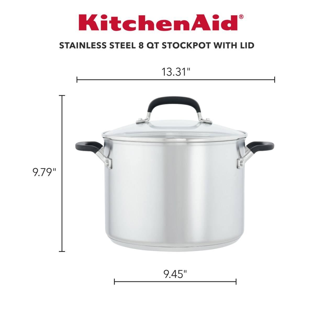 Ignite kitchen creativity and experience rich flavor with the KitchenAid® stainless steel stockpot with lid. Crafted from durable stainless steel with a layer of heat-conductive aluminum in the base, this versatile pot is designed to heat quickly and evenly to slow cook and brew flavorful broths with ease. Featuring etched measuring marks to add measured ingredients and comes with a tempered glass lid to easily lock in heat, drawing out rich flavors when cooking chicken soup, clam chowder, chili, and other stockpot favorites. The steel handles have been finished with silicone grips for a cooler handle while cooking. Oven safe to 400°F (350°F with lids) for making a wide range of delicious recipes.