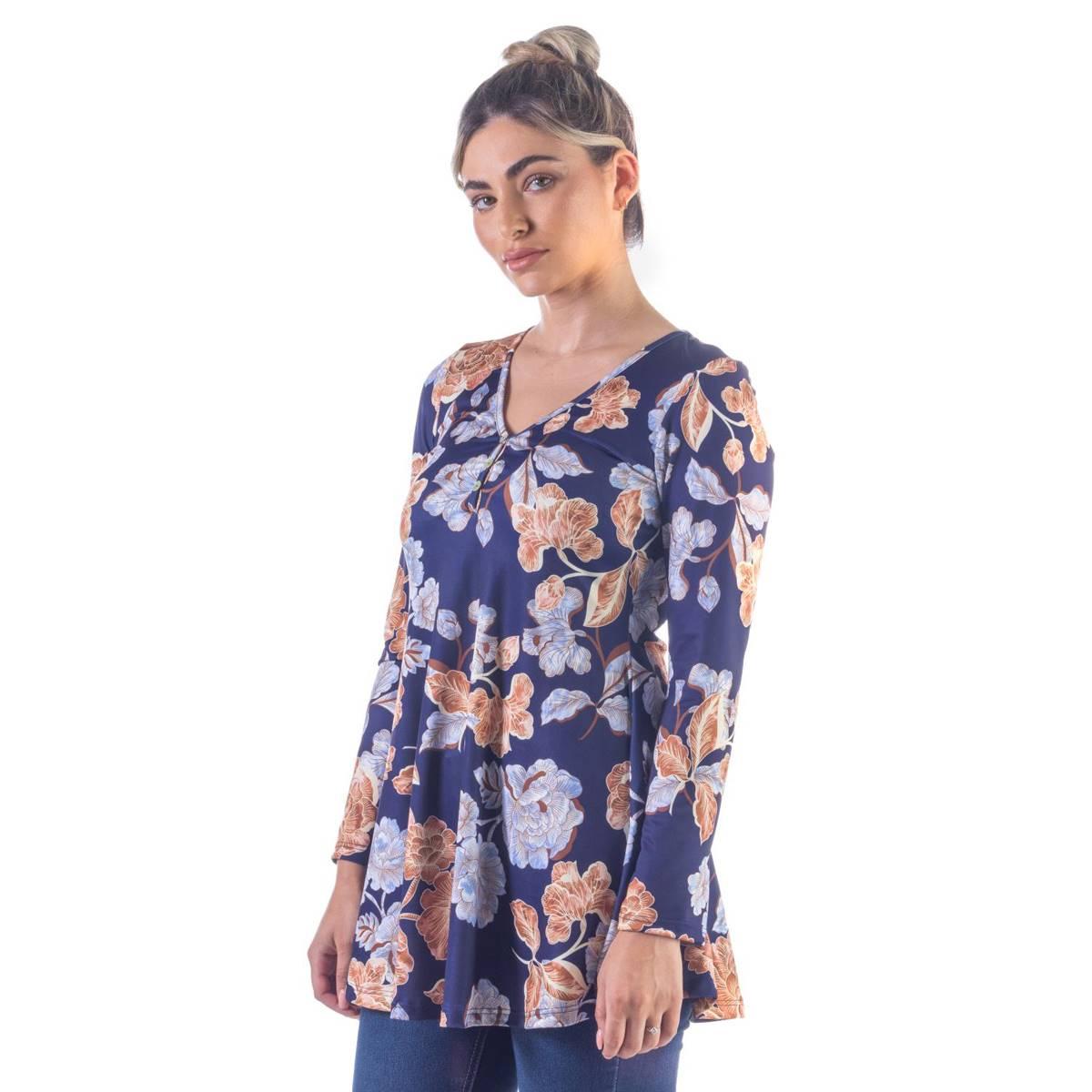 Description This Womens 24/7 Comfort Apparel floral long sleeve tunic is a perfect addition to your wardrobe. Featuring a v-shaped neckline, long sleeves, and a relaxed flared...