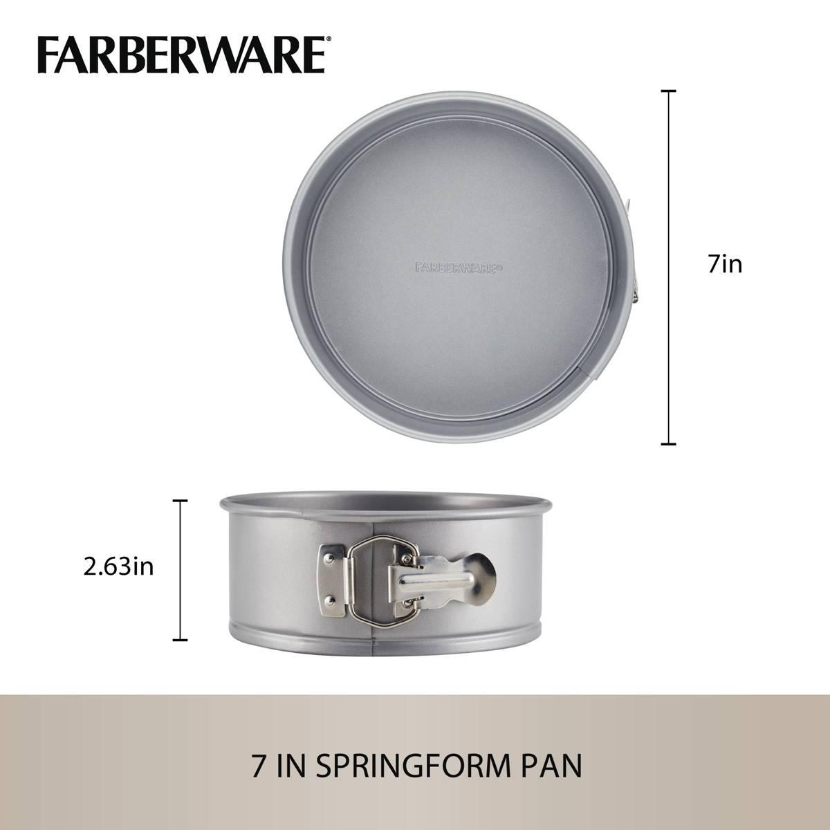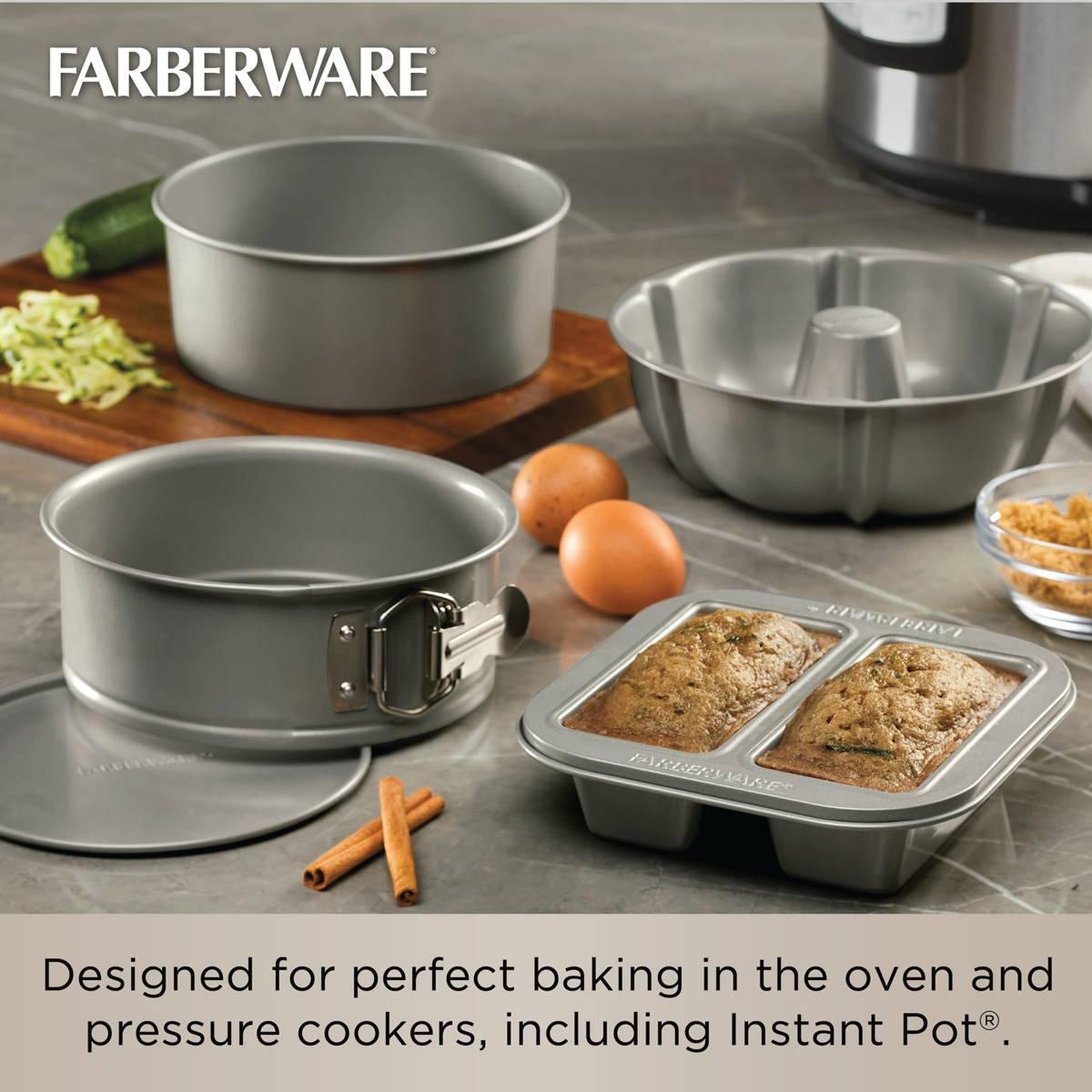 Ready, set, bake! Or roast, toast, oven bake, and pressure cook your way to delicious recipes with the Farberware® specialty bakeware non-stick 4-piece pressure cooker bakeware set. This set of easy-to-use, easy-to-clean non-stick baking pans has been specially crafted to withstand the pressure of a pressure cooker but is versatile enough to be used in the oven to create all your sweet and savory treats and meals. With a 7-inch round cake pan, a 7-inch springform pan, an 8.25-inch fluted mold, and a 2-cup mini loaf pan, this set have all the essentials for baking mini birthday cakes, cheesecakes, angel food and pineapple upside down cakes, zucchini bread, banana bread, and more. The durable, bakeware has been crafted from high-quality aluminized steel to resist warping and dinging. Enhanced non-stick delivers excellent food release, and the baking pans are dishwasher safe for easy cleanup oven safe to 450°F.