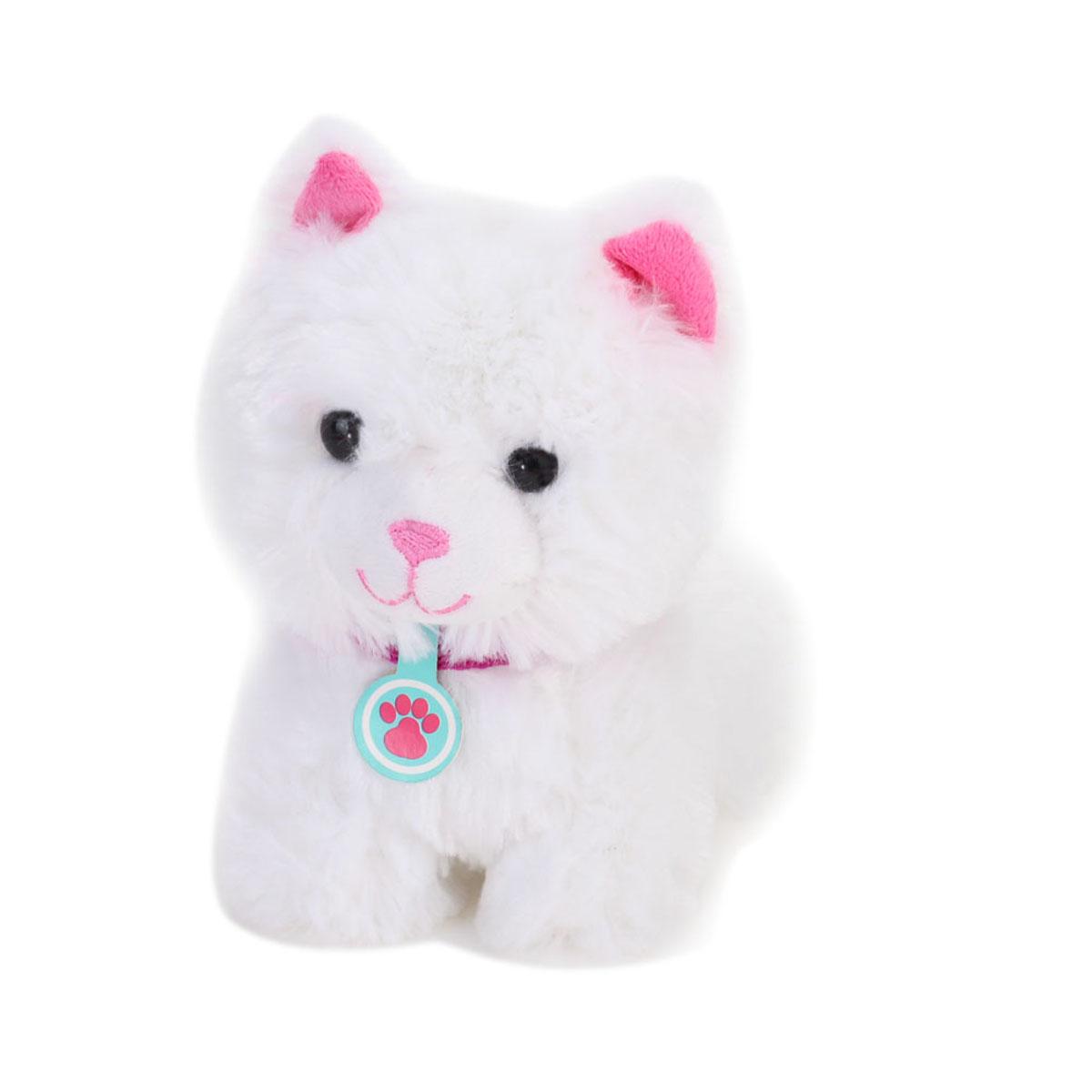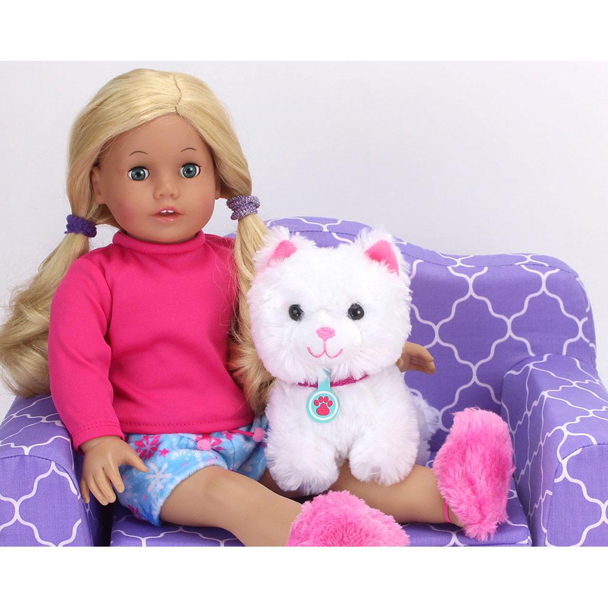 Give your little one everything they need to play and take care of their new friend with Sophia’s® by Teamson kids white kitty cat and carrier accessories set! The set includes a 6-inch plush kitten, collar, leash, food bowl, brush, toy ball, toy mouse, kitty bed, blanket, and carrier. Their new furry friend can travel everywhere with them inside the paw print carrying case with a zipper opening and mesh window for easy storage and hours of endless fun.