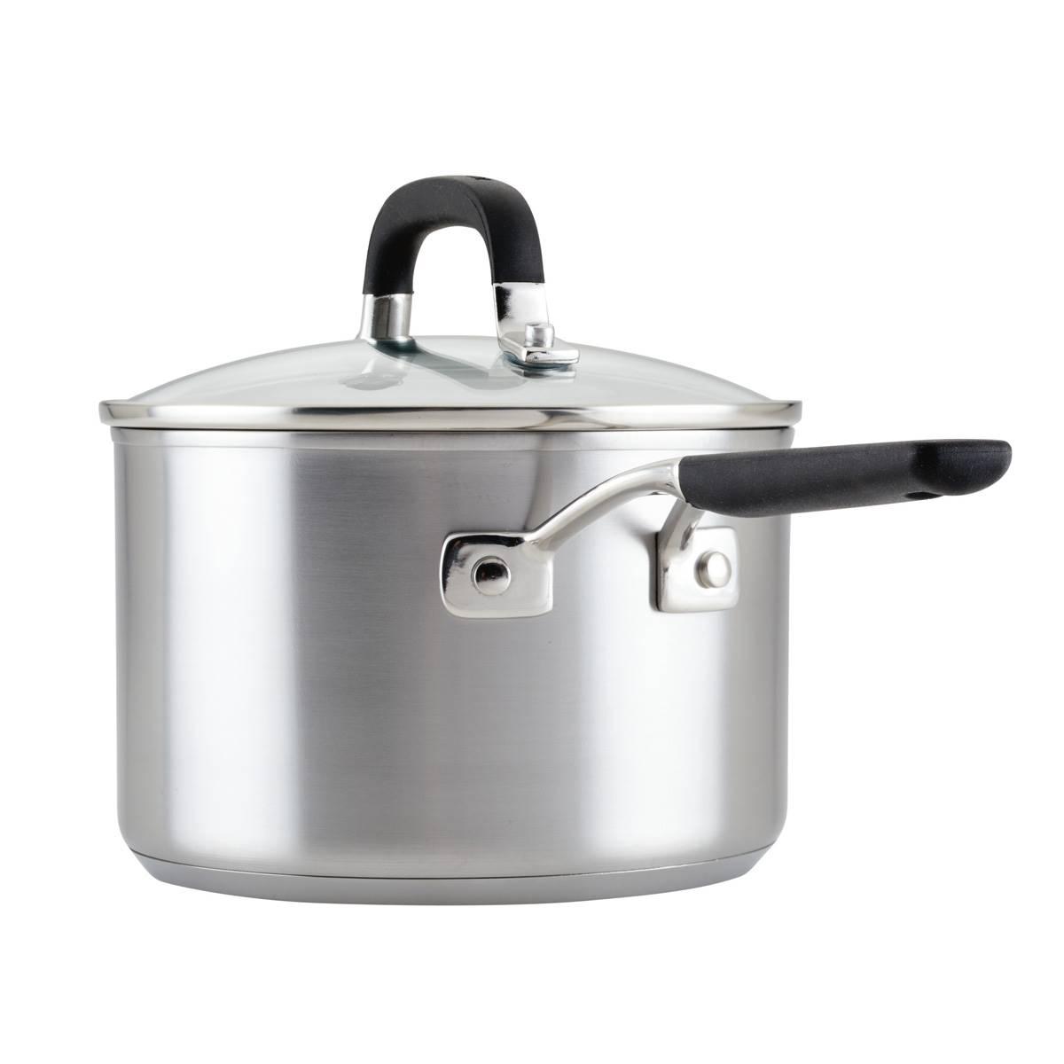 Ignite kitchen creativity and experience rich flavor with the KitchenAid® stainless steel saucepan with lid. Crafted from durable stainless steel with a layer of heat-conductive aluminum in the base, this versatile saucepan is designed to heat quickly and evenly to boil and simmer with ease when crafting rich sauces, savory gravies, or balanced reductions. The tempered glass lid locks in heat to bring out the most of every ingredient, resulting in rich, flavorful meals and sauces. The stainless steel handle has been finished with a silicone grip for a cooler handle while cooking, when compared to traditional stainless steel handles. Dishwasher safe for quick, easy cleanup, induction-suitable, and oven safe to 400°F (350°F with lid), this three-quart saucepan is ideal for making a wide range of delicious recipes.