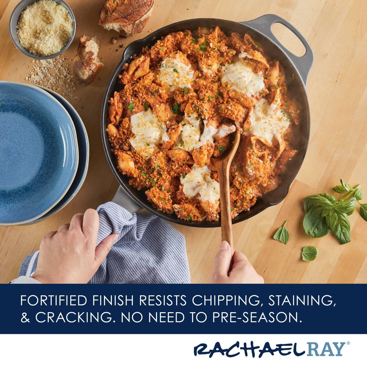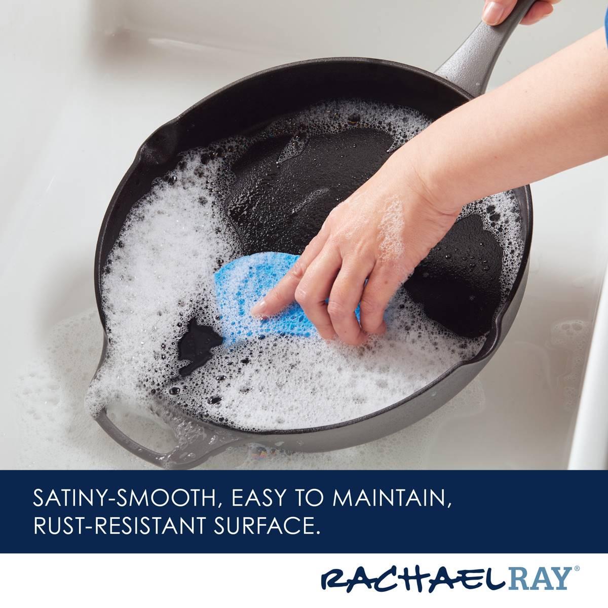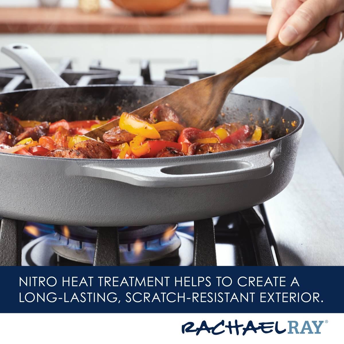 Meet your new kitchen hero! Get incredible cast iron performance that´s easy to maintain with this Rachael Ray NITRO Cast Iron Skillet that delivers the classic durability and performance of cast iron without the hassle of complicated cleaning. A next-generation NITRO heat treatment seals and smooths surface for amazing, easy-to-use, easy-to-clean cast iron that´s fortified to resist rust, chipping, and staining. Wash it, scrub it, and crank it up on the stovetop or in the oven! This extra roomy 12-inch cast iron frying pan features a helper handle for all of your stove-to-oven recipes and built-in spouts for easy pouring, and the satiny-smooth NITRO finish holds brilliant colors to complement any kitchen. Induction capable and made to last a lifetime (and look great for a lifetime, too), this durable meal maker is pre-seasoned and ready to deliver. See why cast iron is one of Rachael´s favorite ways to make meals even more delish.