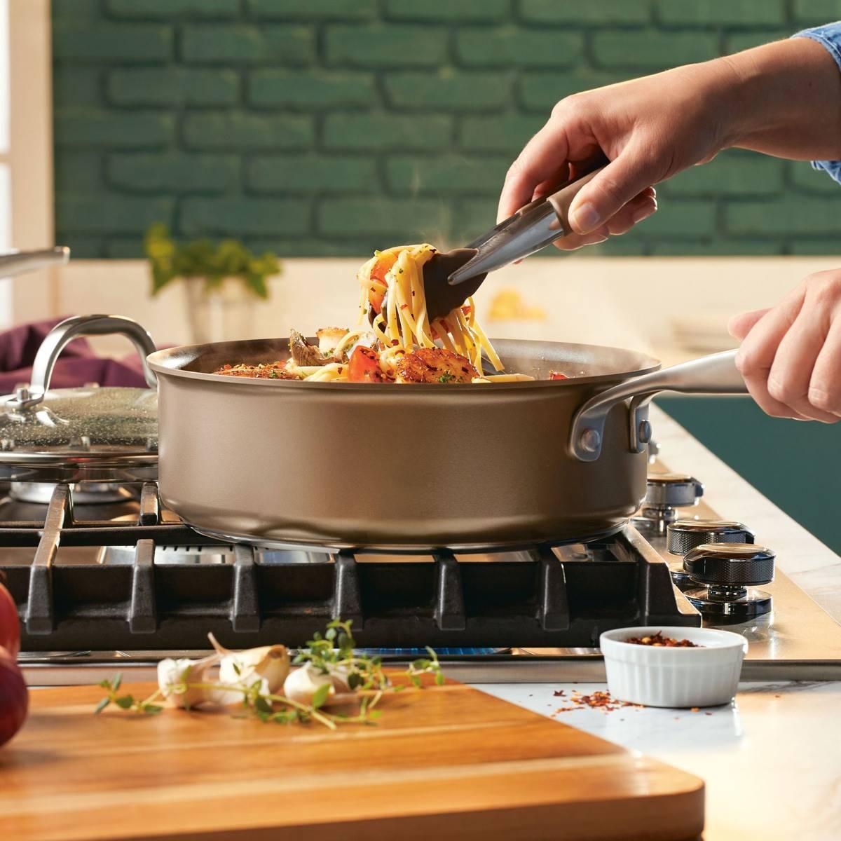 • PREMIUM DURABILITY: Hard anodized toughness with a thick, edge-to-edge stainless steel base for a nonstick sauce making pan that works on any stovetop, including induction. Plus the versatility to go oven safe up to 500°F (350°F with lid).