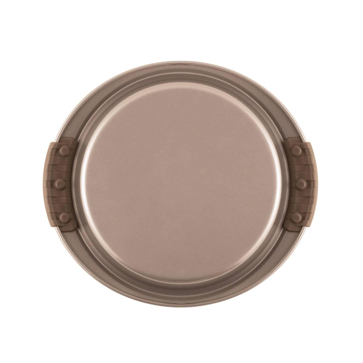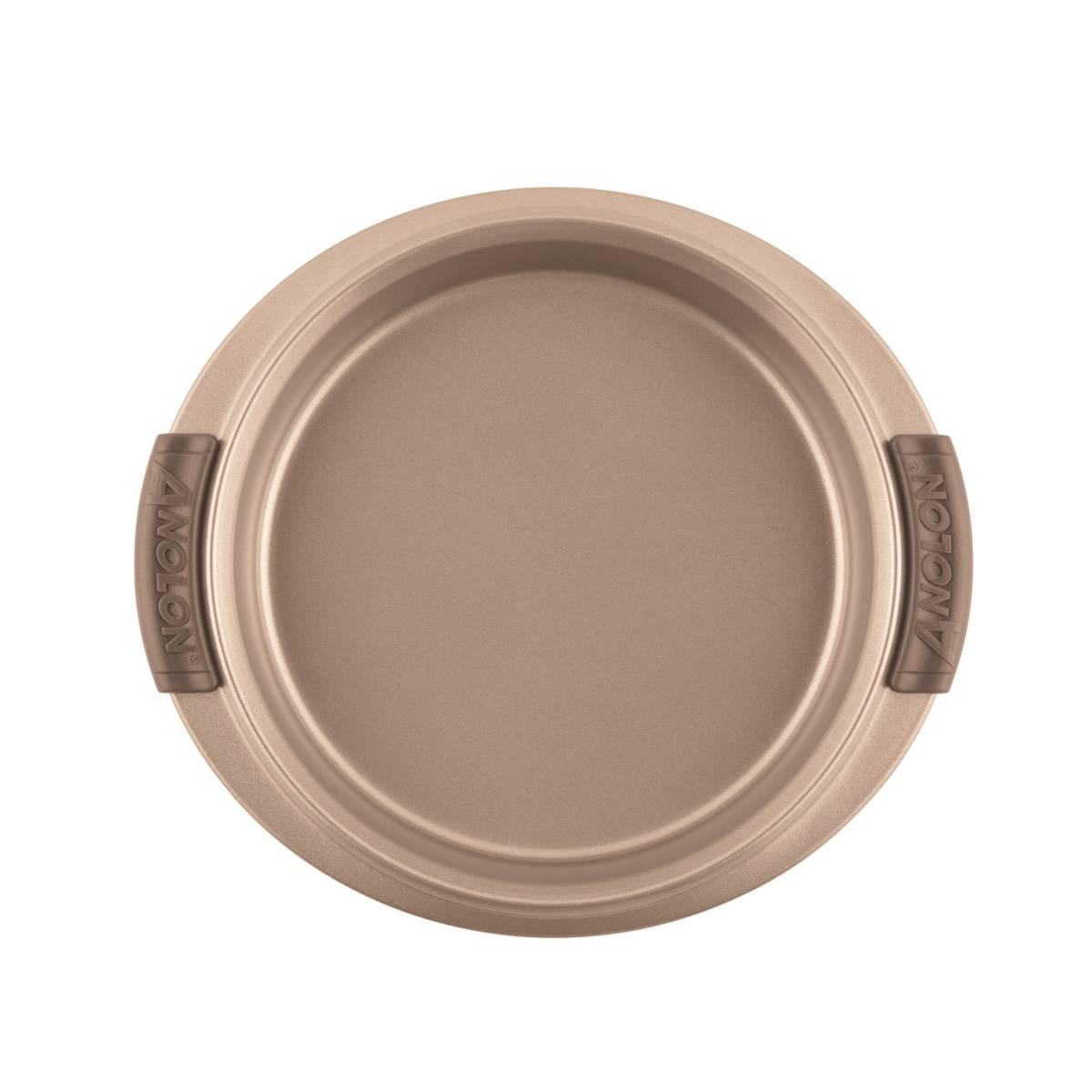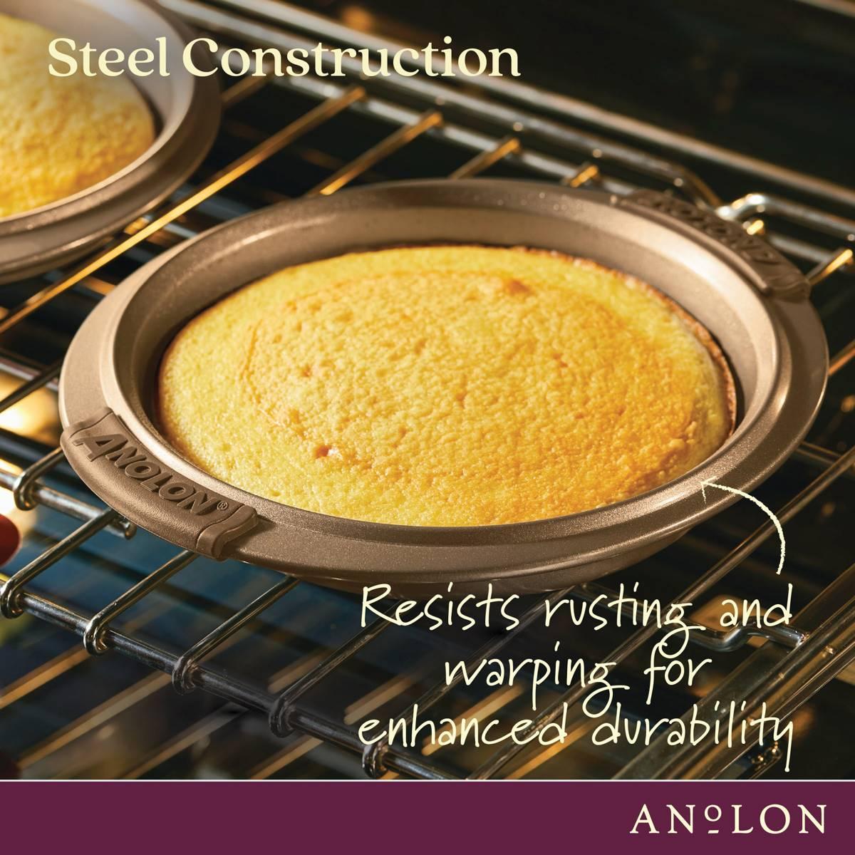 Welcome to exceptional bakeware for dedicated bakers. This set of Anolon® Advanced nonstick round cake pans are designed to deliver great baking results with both ease and efficiency, and measures up to the high standards of dedicated bakers and cake lovers alike. Ideal for baking layered cakes, these versatile, dishwasher safe cake pans are ideal for baking birthday, baby shower, or holiday cakes, and can easily roast veggies and other savory recipes, too.. Oven safe to 450°F, these nonstick cake pans are crafted from heavy gauge steel to resist warping and feature a beautiful bronze color tone to promote even browning and provide the even heat distribution necessary for successful baking and roasting.