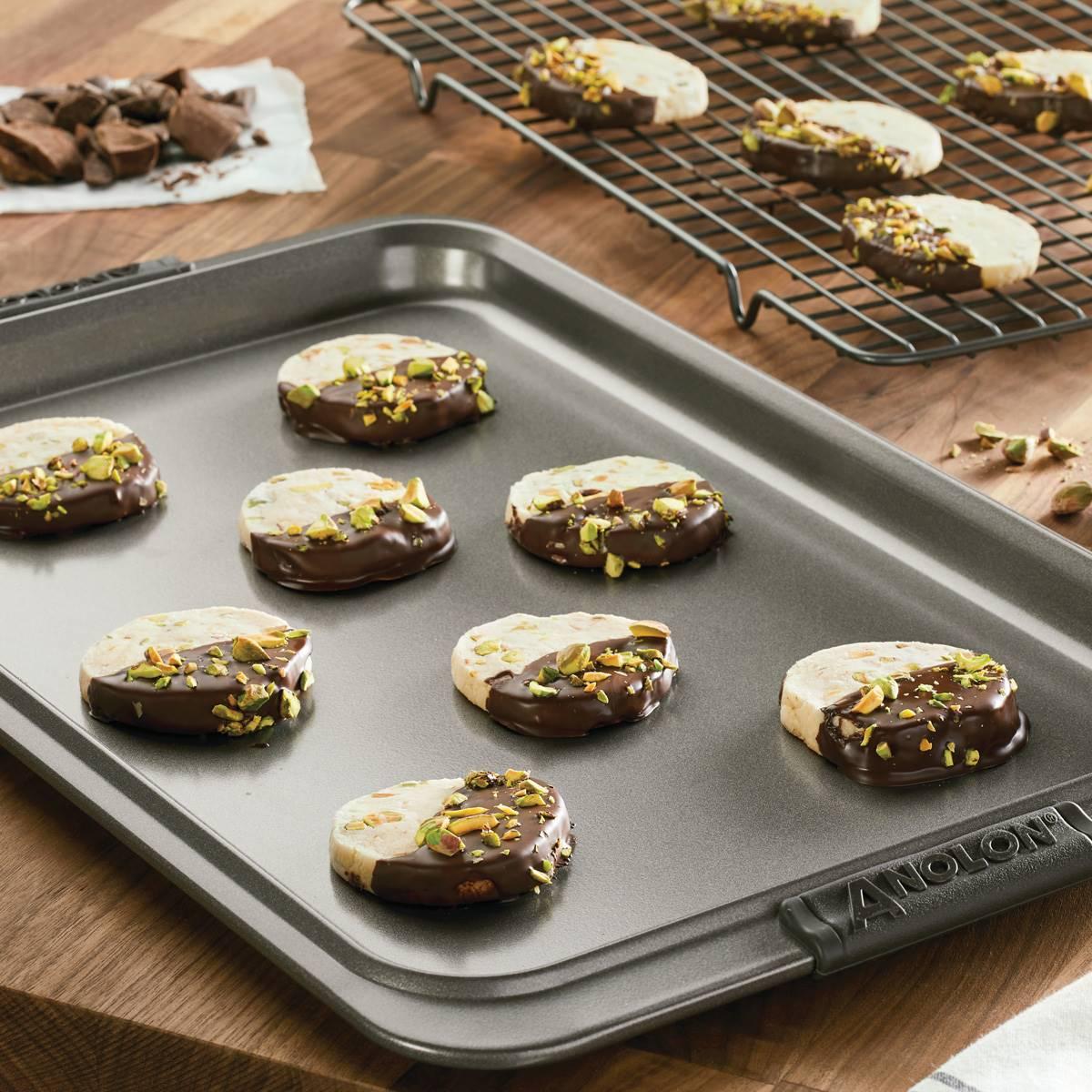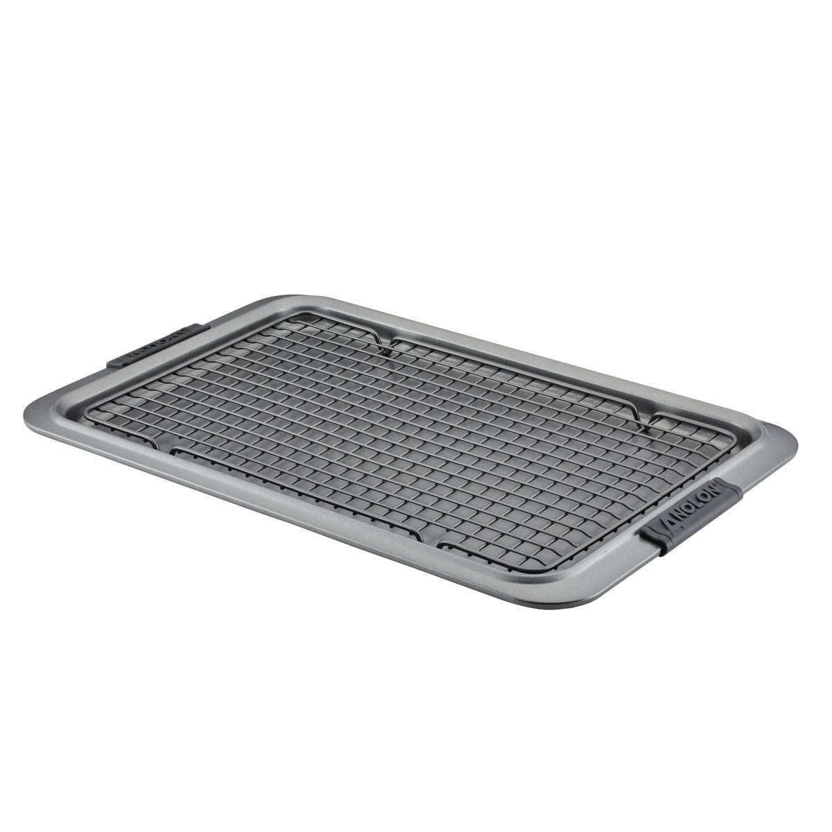 Welcome to exceptional bakeware for dedicated bakers. This Anolon Advanced bakeware nonstick sheet pan and cooling rack set is designed to deliver great baking results with both ease and efficiency, and measures up to the high standards of dedicated bakers, cookie lovers, and sheet pan meal connoisseurs alike. Ready for roasting and baking big sheet-pan dinners, this versatile, dishwasher safe pan set includes a roasting rack that fits inside of the sheet pan for a boost of air circulation (plus it doubles as a cooling rack for batches of cookies!). Oven safe to 450°F, this nonstick sheet pan and roasting rack set is crafted from heavy gauge steel to resist warping and feature a classic medium gray color tone to promote even browning and provide the even heat distribution necessary to successful baking and roasting.