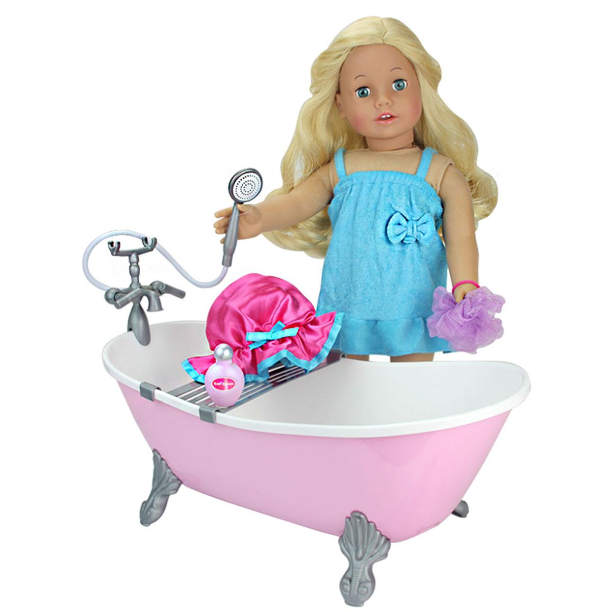 Give your little one everything they need for a fun bath time with their doll with the Sophia’s by Teamson bathtub and shower accessories set. This set includes a light pink claw foot bathtub with white lining and a showerhead, a blue terry dress, a hot pink satin bathing cap, a purple sponge, pretend shampoo, conditioner, bubble bath, and a silver tray for a complete bathing set that will provide hours of endless fun bathing experience.