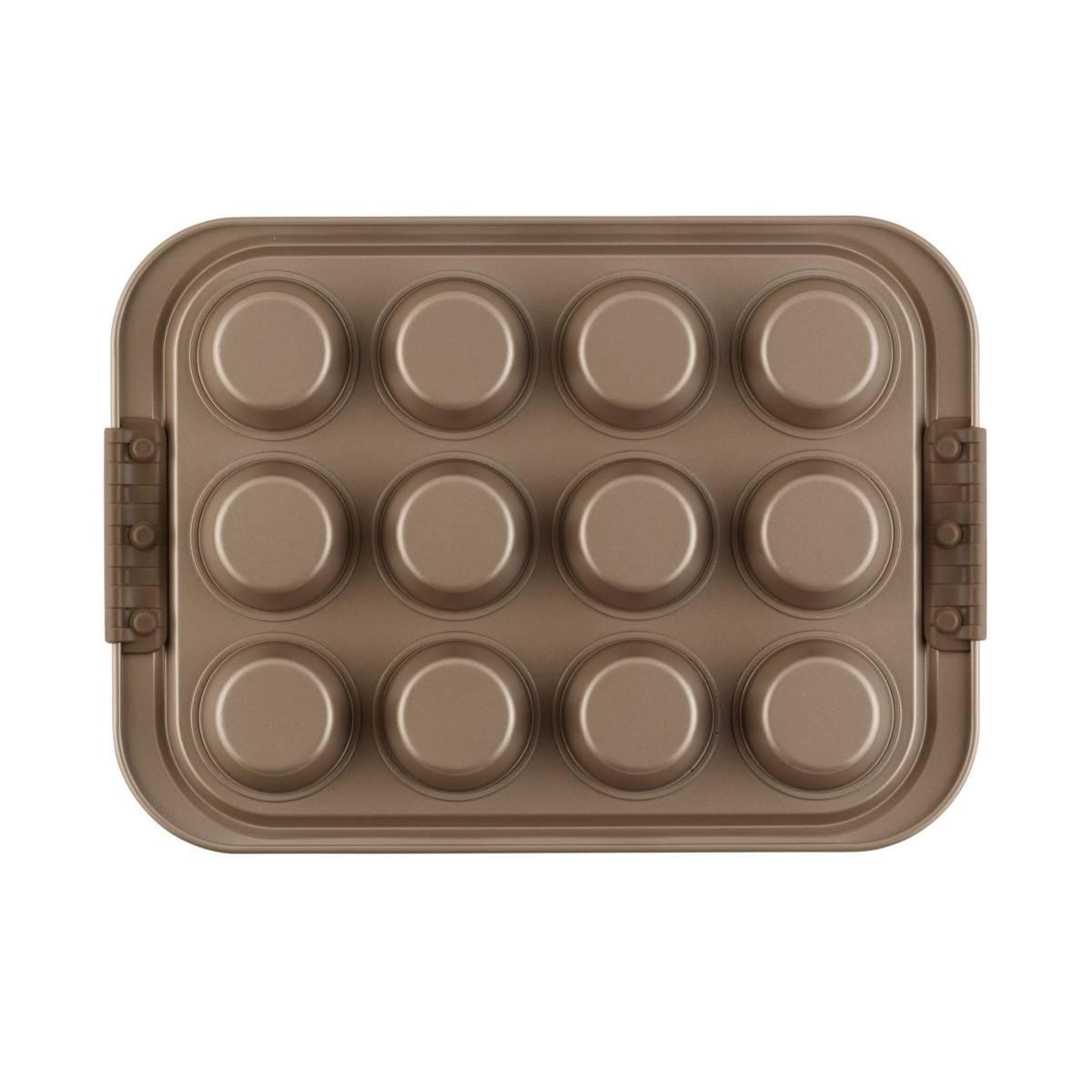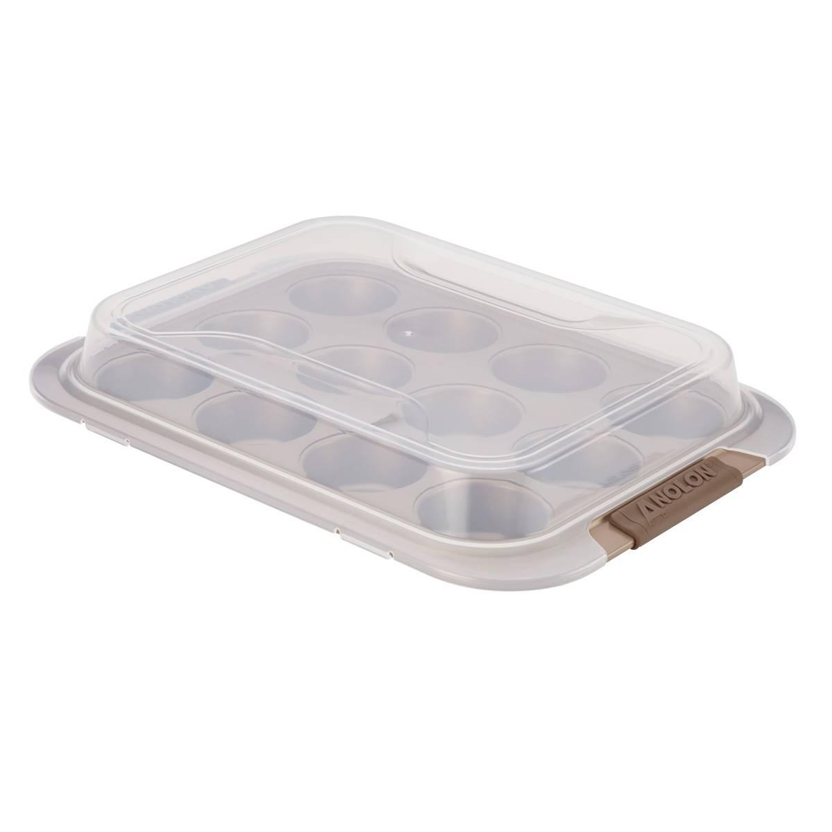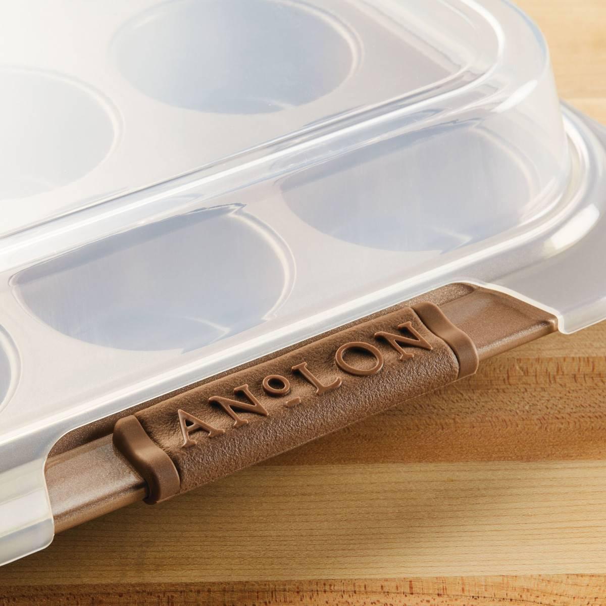 Welcome to exceptional bakeware for dedicated bakers. Designed to deliver great baking results with both ease and efficiency, this Anolon® Advanced bronze nonstick muffin pan measures up to the high standards of dedicated bakers and muffin lovers alike. A versatile, dishwasher-safe muffin tin is ideal for baking blueberry muffins, popovers, and taco cups. The sturdy, clear plastic lid snaps onto the muffin pan to protect baked goods´ appearance and freshness for picnics, parties, and potlucks. Oven safe to 450°F, this nonstick pan is crafted from heavy gauge steel to resist warping and features a beautiful bronze color tone to promote even browning and provide the even heat distribution necessary for successful baking and roasting. The lid is not intended for oven use.