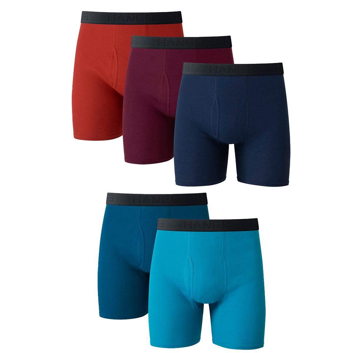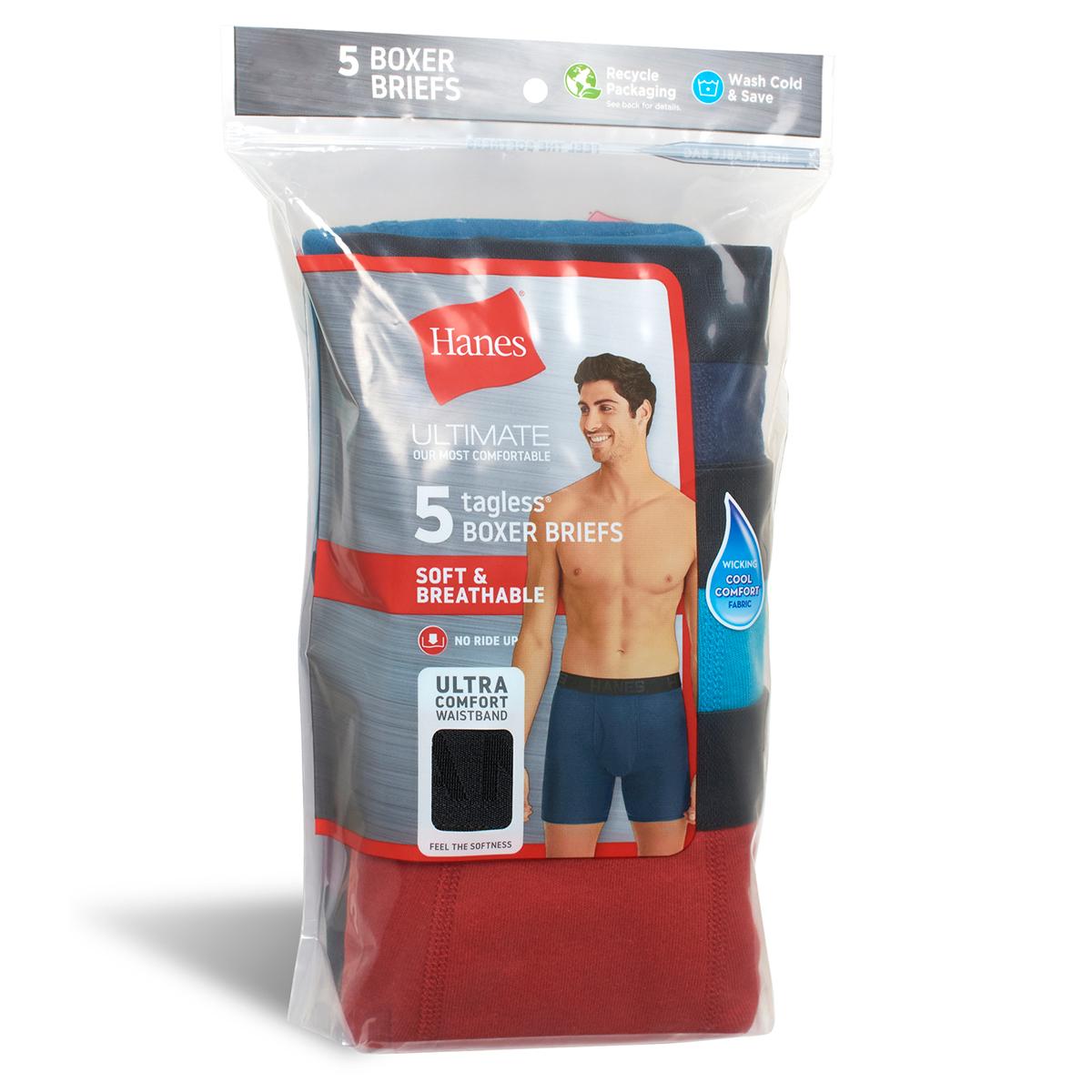 Description Elevate your everyday essentials with this Mens Hanes Ultimate® 5-pack of breathable boxer briefs. Comfort flex waistbandNo ride-up legSoft ring spun fabricTagless...