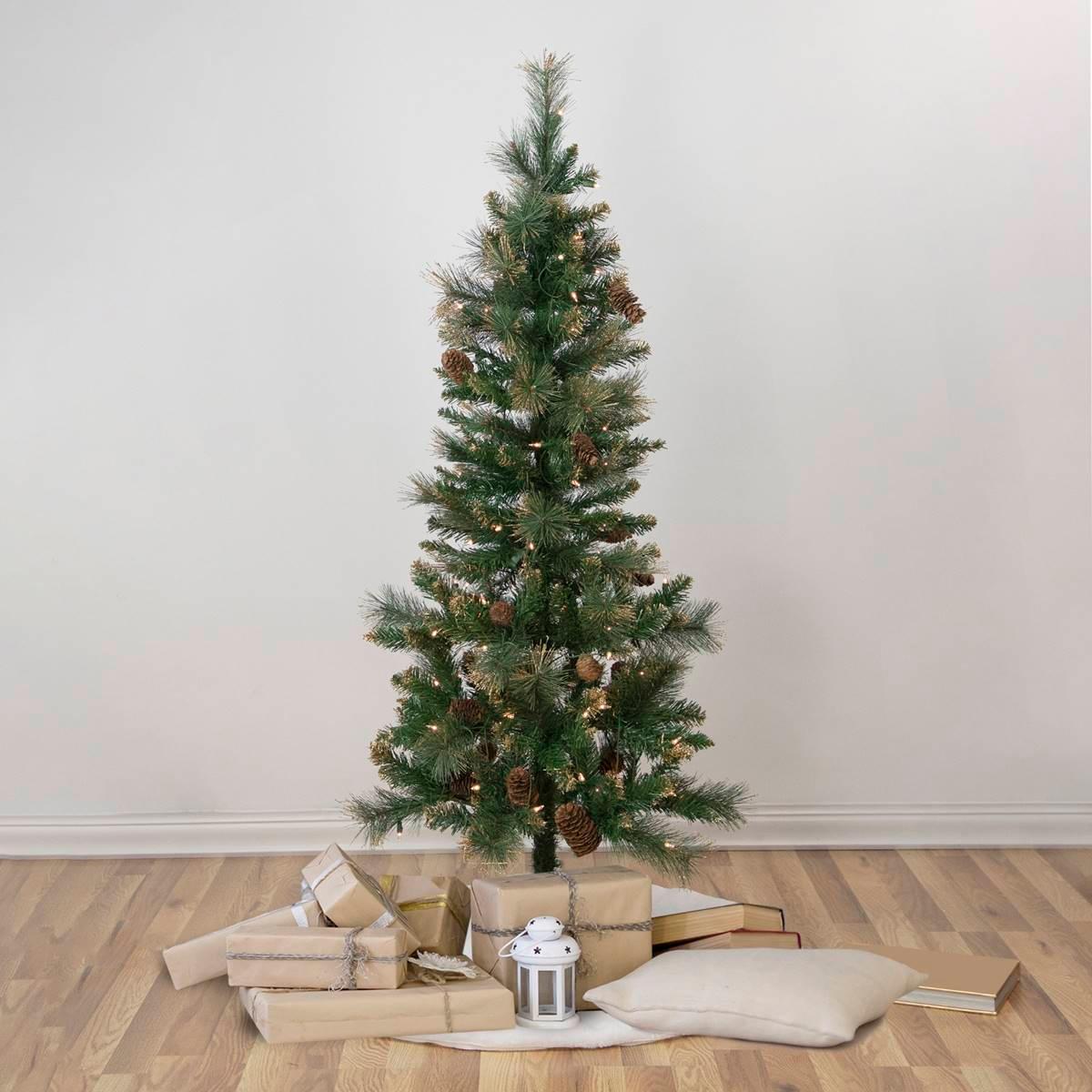 Get your home ready for the holiday season with this Northlight Seasonal 4.5-foot Yorkshire pine artificial Christmas tree! Featuring a mixture of traditional green two-tone PVC tips and long pine needles to give the tree a nice full look. The tree comes pre-strung with incandescent mini clear lights and accented with pine cones and lightly dusted sparkling gold glitter.