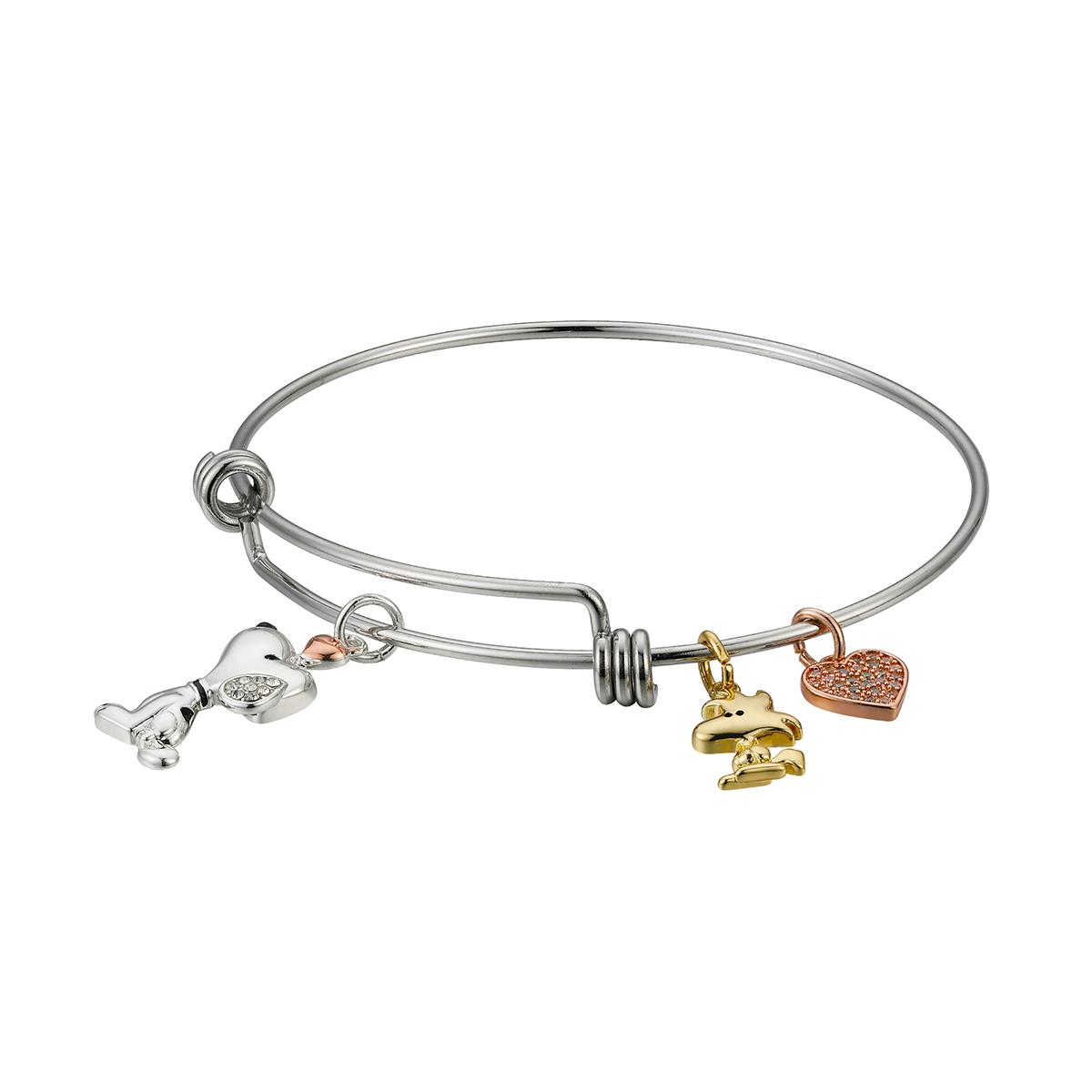 Description Show off your love for the Peanuts gang with the Shine 2.5-inch brass Peanuts tri-tone Snoopy and Woodstock clear crystal heart bangle bracelet. Charm 27x12mm...