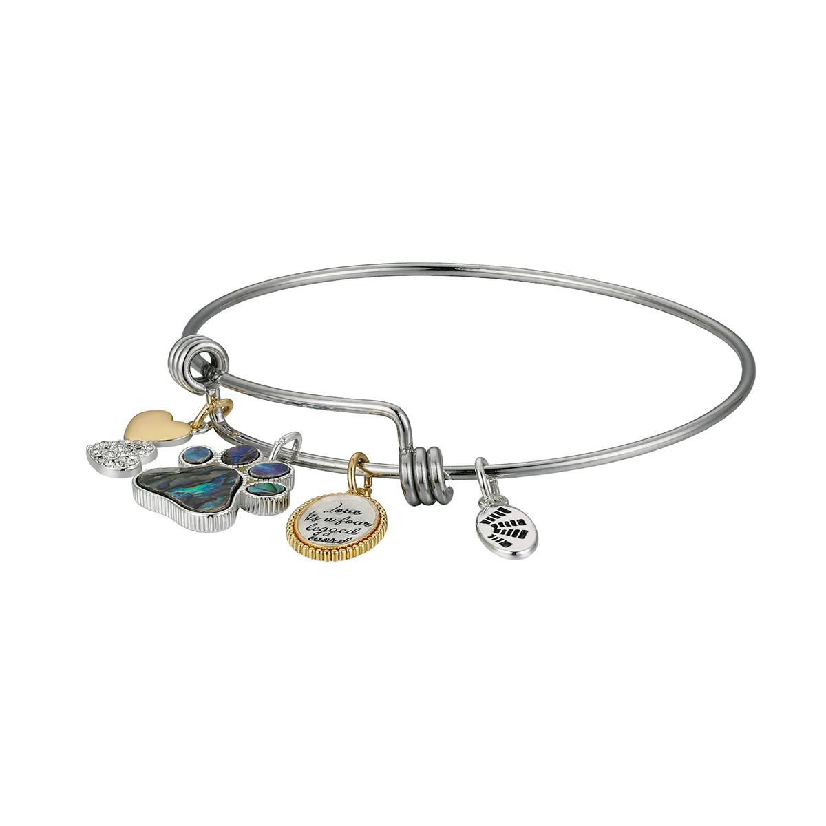 Show off your love for your furry friend with the Shine brass 2.5-inch two-tone "Love is a four-legged word" abalone paw crystal heart bangle bracelet.