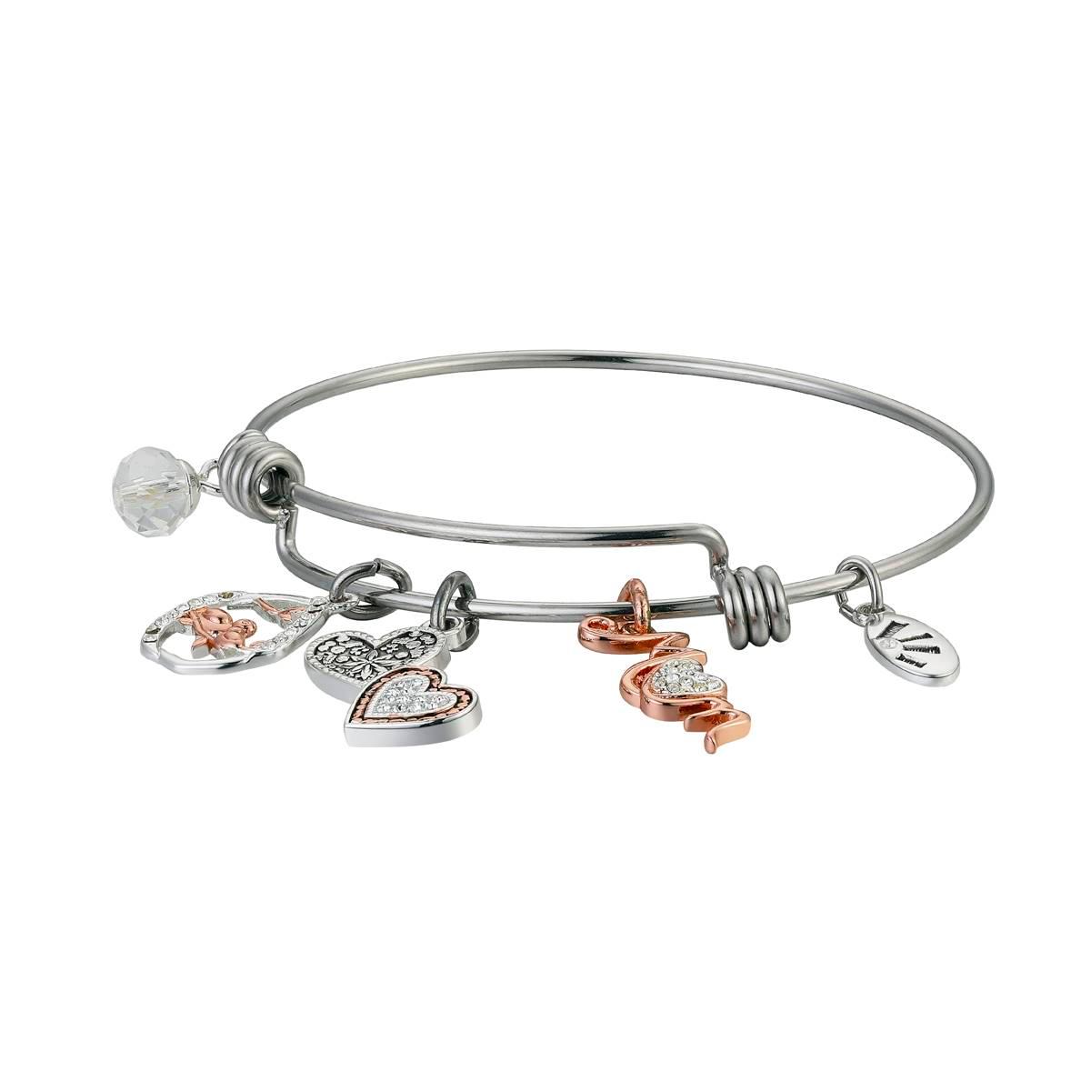 Show her some love when you give her this Shine 2.5-inch brass "Mom" birds and hearts clear crystal rose gold two-tone bangle bracelet.