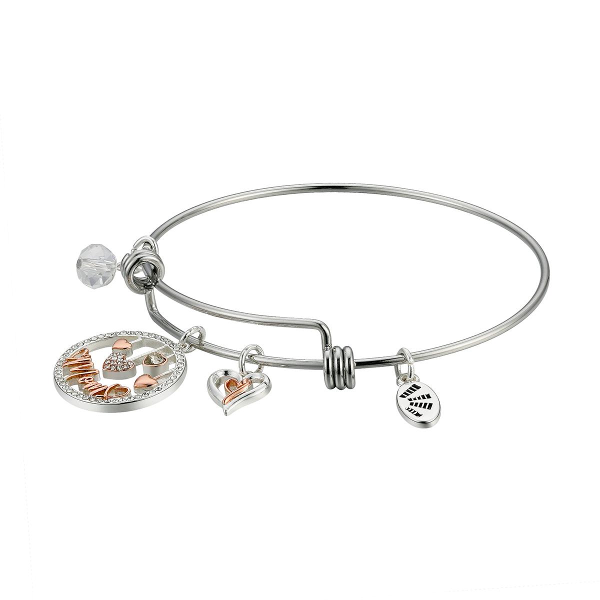Celebrate Mom with the Shine 2.5-inch brass rose gold two-tone "Mom" hearts crystal bangle bracelet.