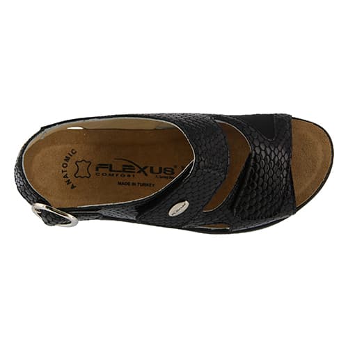 These Womens Flexus® by Spring Step Aksamala slingback wedge sandals showcase premium python embossed leather uppers with 3 adjustable and detailed straps with a metal logo. They feature a rounded toe silhouette, tonal stitching, breathable leather lining, removable leather padded insoles, and durable polyurethane outsoles with a flexible forefoot. Heel Height: 1 1/2 inches.