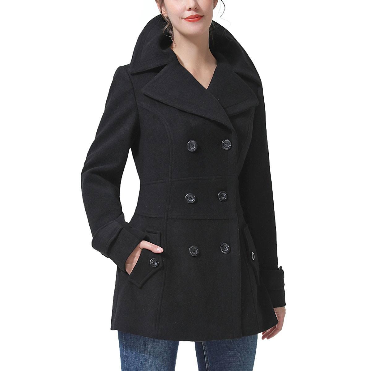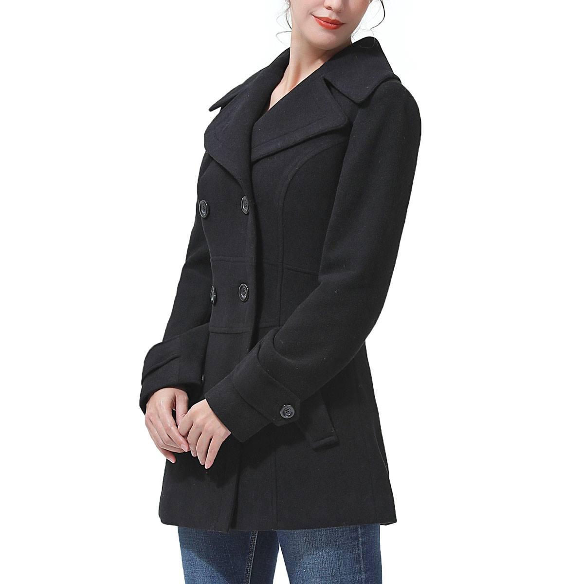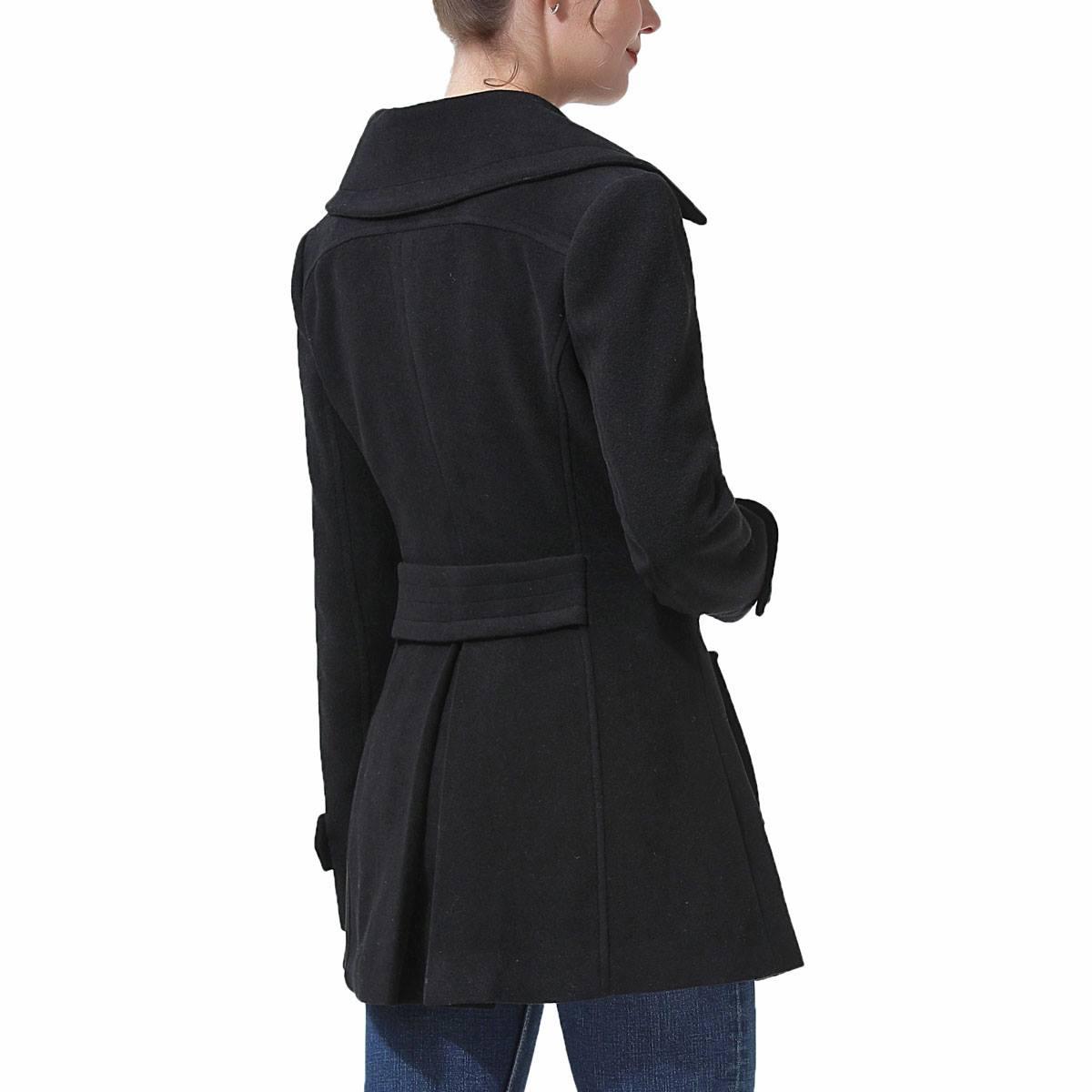 Upgrade your outfit with this Womens BGSD wool peacoat. This beloved double-breasted peacoat cut from warming wool plays perfectly with a pleated back to offer a lady-like vibe. Features two exterior pockets and two interior pockets.