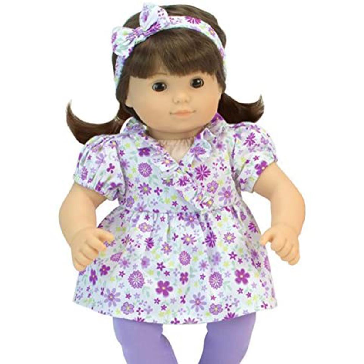 Give your little one fun clothes for dressing up their dolls with the Sophia®’s by Teamson Kids tops, leggings, headbands, and shoes set. This set includes many pieces for your twin dolls or additional mix-and-match options that provide hours of endless fun for your children´s dolls. A floral pink and purple top, pink and purple leggings, matching headbands, lime suede moccasins, and soft sole purple shoes with a butterfly design will allow your little one to accessorize their doll to look just like themselves.