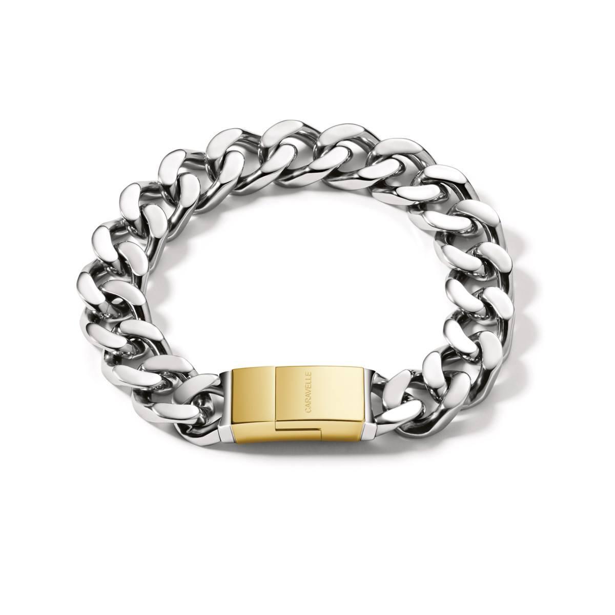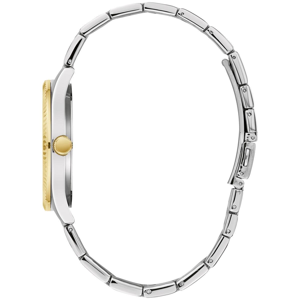 Elegant and perfect define this Caravelle by Bulova gift set from the Dress collection. The timepiece includes a black sunray dial with a calendar window at 3 o’clock, a gold-tone coin edge bezel, and a polished two-tone stainless steel bracelet. A silver-tone stainless steel jewelry bracelet completes the gift set with a heavy curb chain design and a gold-tone magnetic closure and water resistant up to 30 meters.