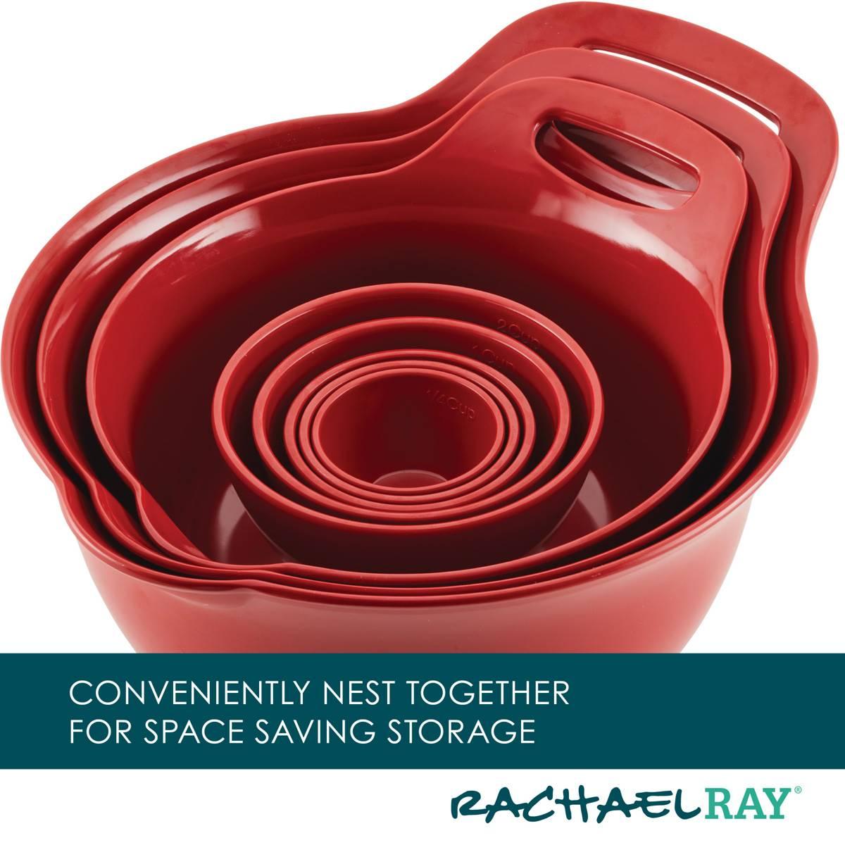 Measure out the perfect amount of ingredients, and keep your kitchen organized with the Rachael Ray Mix and Measure Set. This kitchen essentials set includes three nesting mixing bowls, five nesting measuring cups, a spatula, and a spoonula.