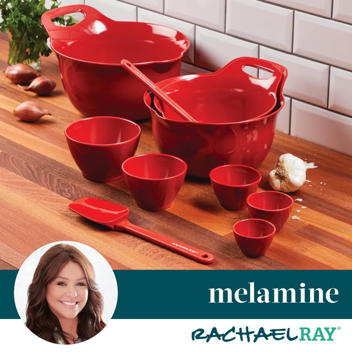 - DURABLE AND VERSATILE: Colorful Bowls, cups, and kitchen utensils are made from lightweight melamine construction for long-lasting measuring, prepping, and mixing performance.