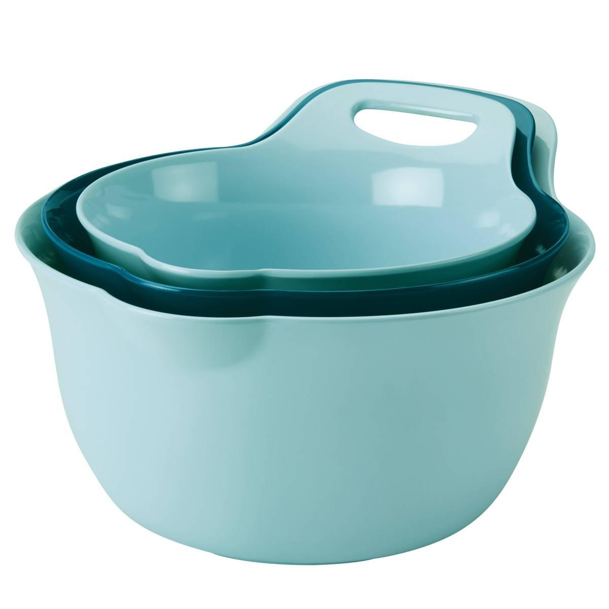 - NESTING BOWLS AND CUPS: Mixing bowls and measuring cups nest in each other for space-saving storage. ANTI-SLIP GRIP: Rubberized bottom helps to prevent melamine mixing bowls from slipping on countertops and other surfaces.