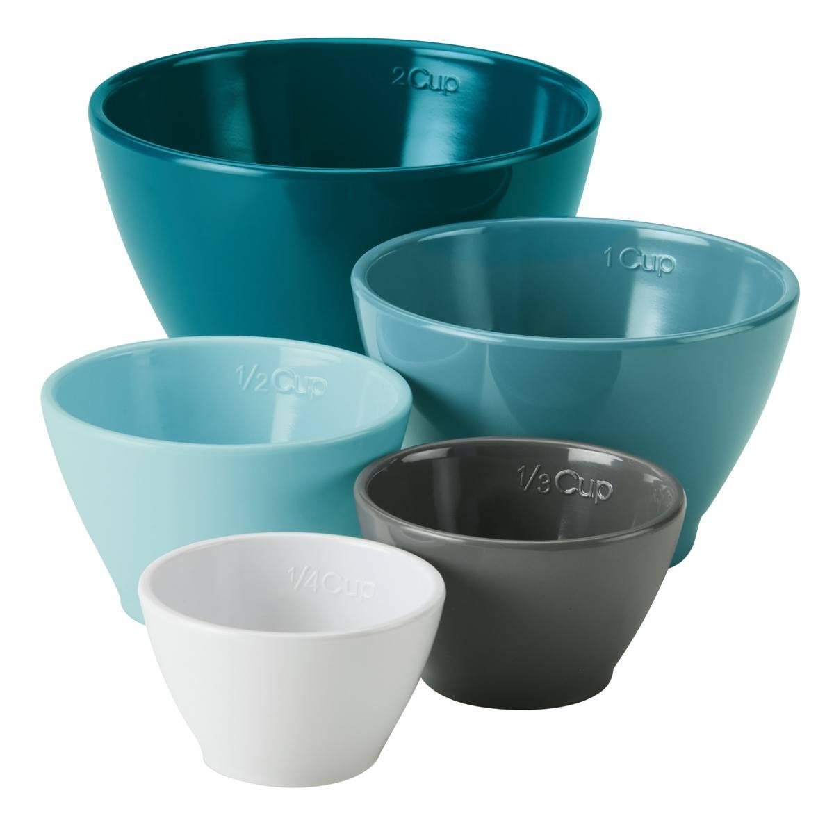 A rubberized bottom keeps the bowls from slipping around on countertops and the color-coordinated measuring cups come in standard 0.25-cup to 2-cup increments.