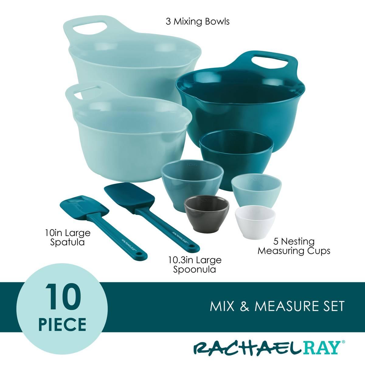 Mix up yummy masterpieces, measure out the perfect amount of ingredients, and keep the kitchen organized with the Rachael Ray Mix and Measure Set. This kitchen essentials set includes three nesting mixing bowls, five nesting measuring cups, a spatula, and a spoonula.