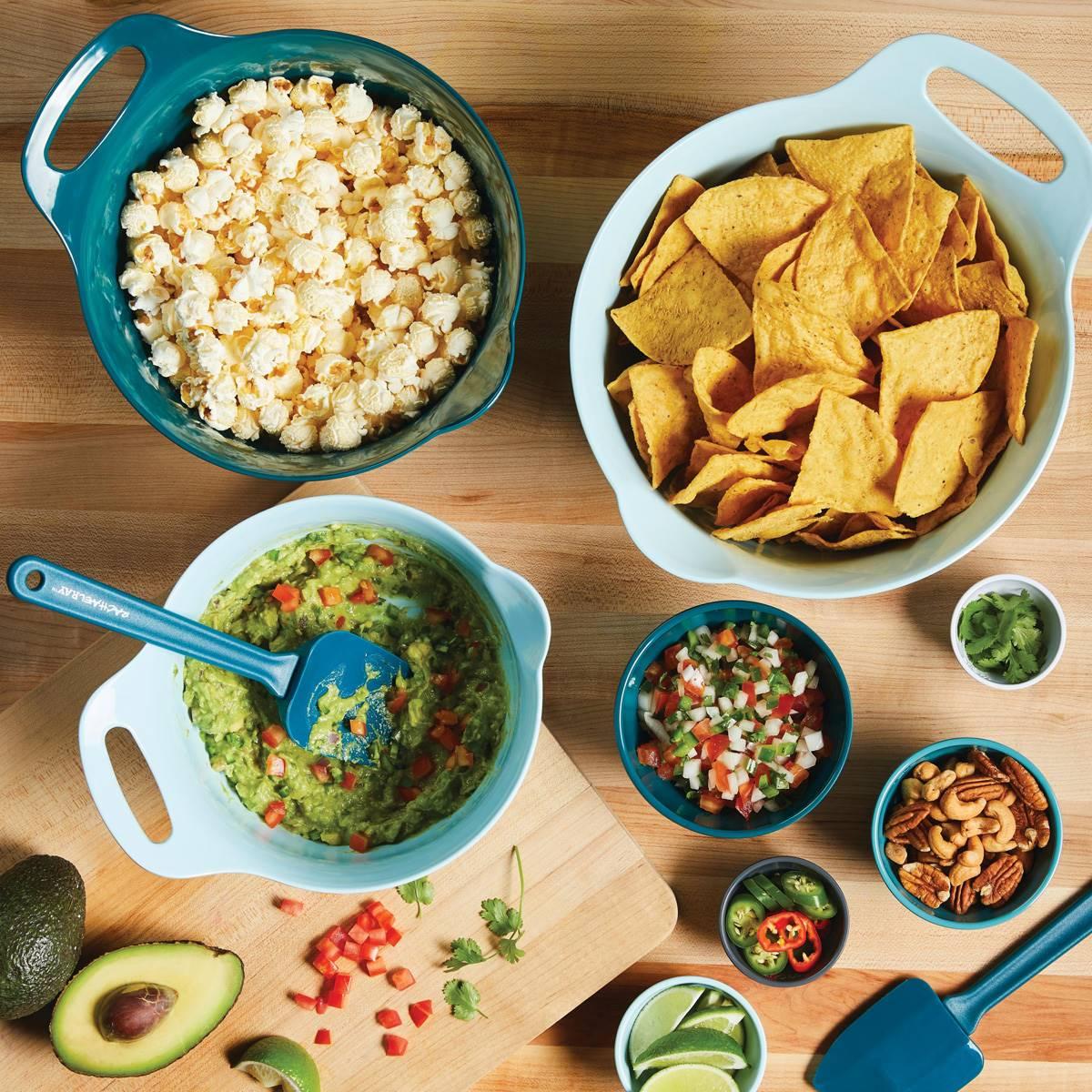 A versatile spatula and a spoonula round out this incredible 10-piece mix-and-measure cup set. Mixing bowls, measuring cups, and kitchen utensils are top-rack dishwasher-safe for easy cleanup.