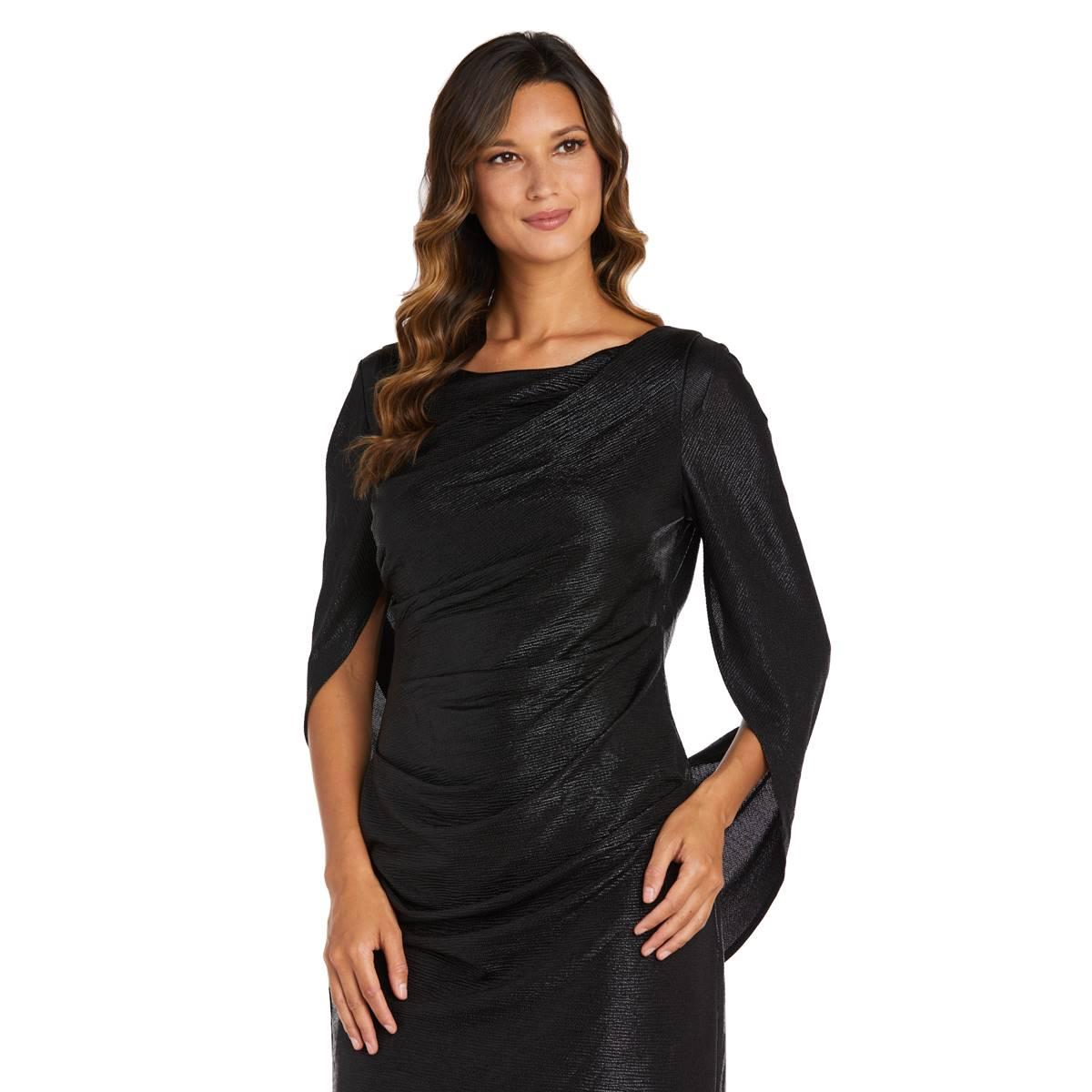 Description Shine in this Womens R&M Richards cocktail dress with draped sleeves. It will give you the edge you need to take on any event. The draped sleeve connects in the back...