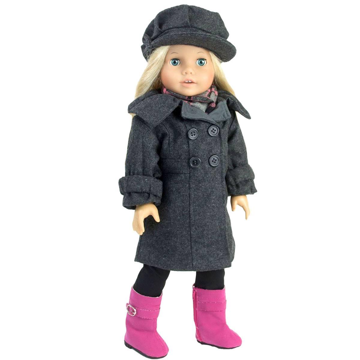 It´s time to get your little one´s doll ready for the cold winter months with the Sophia´s® by Teamson 4-piece winter jacket set. This grey bundle features a knee length wool-like peacoat with a double-breasted flap and buttons, a matching hat, a plaid scarf, and pink boots. Let your child wrap their favorite doll in this warm set to be ready for anything the season has in store — from making snow angels outside to Christmas shopping with her friends.