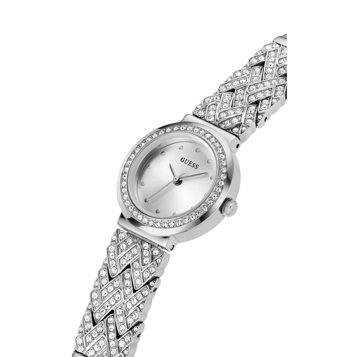 A style that you´ll treasure, this Womens GUESS Watches® silver case stainless steel watch offers a unique bangle design that showcases a chevron pattern entirely made of crystals that sparkle from any angle.